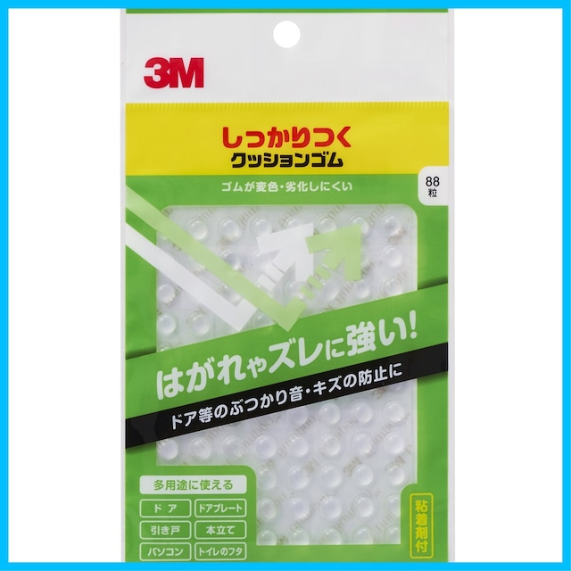 【商品名】 スリーエム(3M) 3M しっかりつくクッションゴム 7.9x2.2mm 丸形 CS-101 透明 88粒 【商品説明】 【製品情報】1粒のサイズ(直径 x 高さ):7.9 x 2.2mm / 形状: 丸形 / 入り数: 88粒 / 素材: ポリウレタン 【はがれやズレに強い、しっかりくっつくクッションゴム!】台紙からはがして必要なところに押し付けるだけ! 接着面のキズを防ぎ、戸あたりやぶつかり音などをやわらげます。トイレのフタやドアの開閉時の音防止やキズ防止に! 【すべり止めや目印としても活躍なクッションゴム】しっかりつけたい椅子やデスクのゴム足、服がずれ落ちてしまうハンガー、スマホスタンド、リモコン、ブックスタンドや収納ボックスなどのすべり止めに! よく間違えて押してしまうスイッチの目印としても使えます! 【透明だから目立たない!】どこにでも自然に馴染む3Mクッションゴム。耐久性が高く、変色や劣化が少ないので、見た目を気にせず用途に合わせて接着できます。 ※本製品は使用方法・使用条件により思わぬ損害を生じることがありますので、事前に目的の用途に適するかどうかをご確認ください。 ●高い接着力で、はがれやズレに強いです。●耐久性が高くゴムの変色や劣化が少ないです。