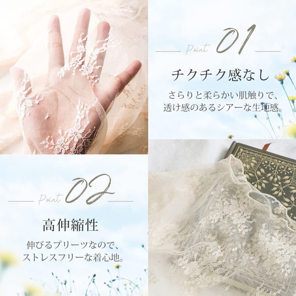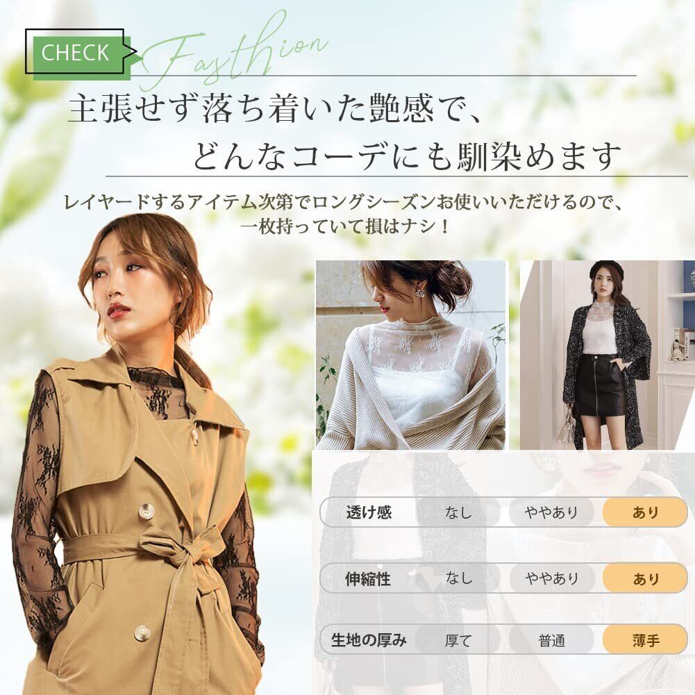 【透け感・総レース】ソフトなシアー・レース生地を使用しており、気になる肌露出を加減でき、またボディラインがきれいに現れ、レディな印象余韻を残します。絶妙な透け感が美しい女性の魅力を引き出してくれます