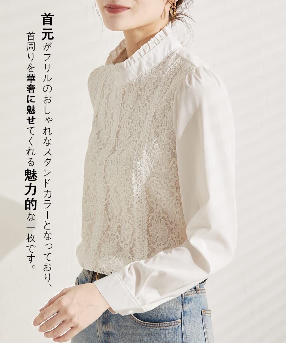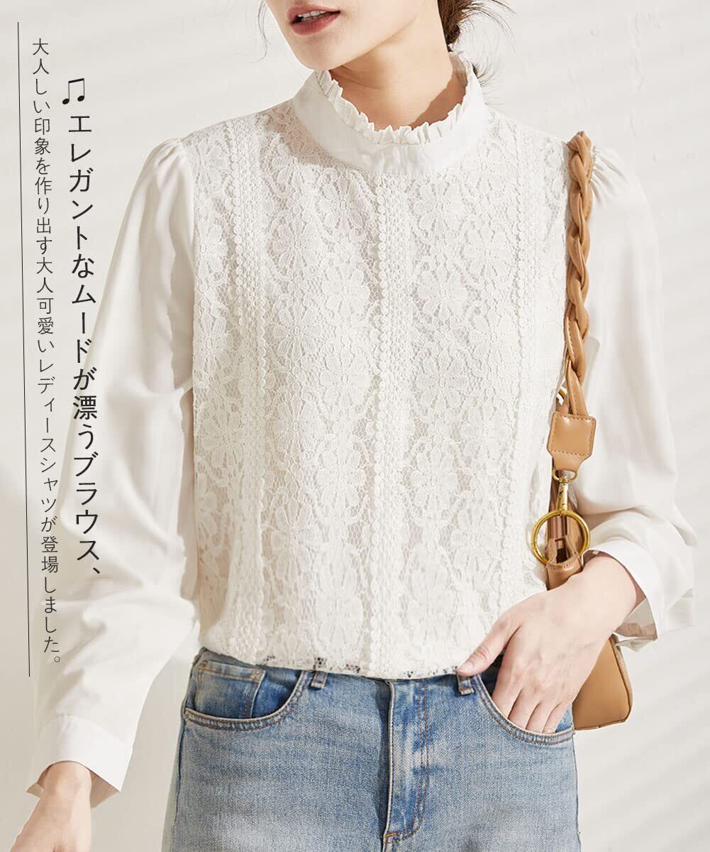 柔らかくて肌触り良い生地で快適な着心地になるブラウスです。首元がフリルのおしゃれなスタンドカラーとなっており、首周りを華奢に魅せてくれる魅力的な一枚です。表は花柄仕様の繊細レースでさりげなく華やかにシャツです!1枚で着用できる程度の厚みがあり、シワになりにくい、常に上品なイメージを保ちます。体に包容性が良くて、体型カバーもばっちり同時に、落ち感ある生地で着痩せ効果が抜群で、どんな服にも合せやすいトップスです。