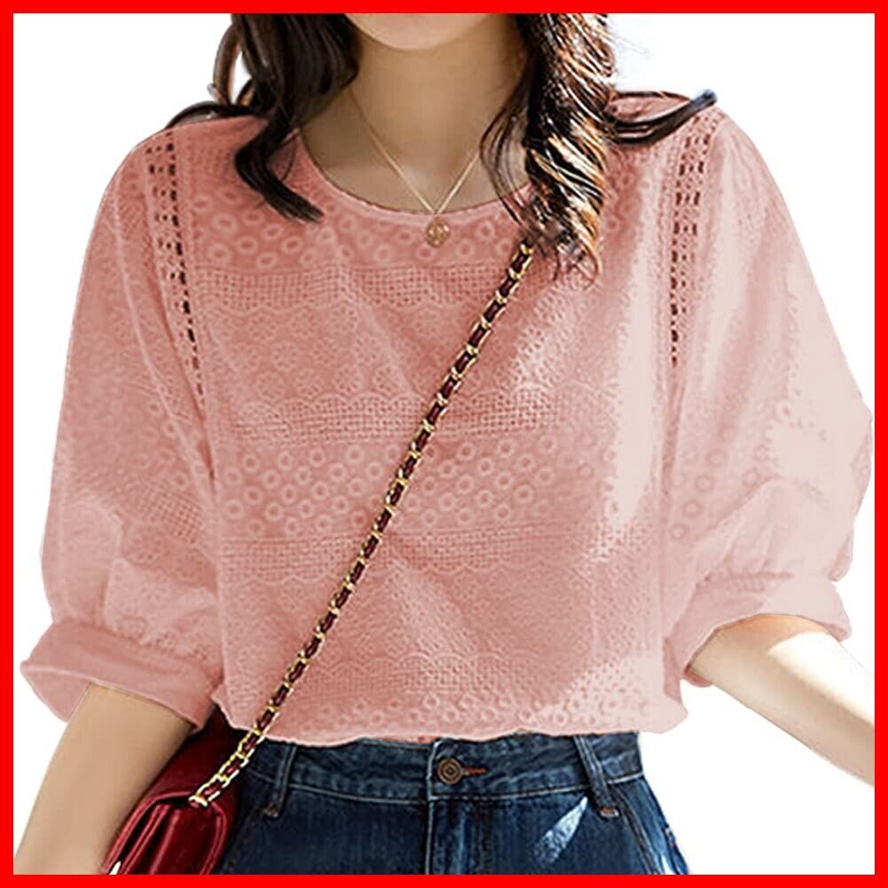 [Yino] (イノ) レース シャツ ブラウス レディース トップス 小花 刺繍 半袖 Uネック 透かし編み 着痩せ 可愛い おしゃれ ボリュームスリーブ 女性らしい カジュアル 通勤 デート お出かけ