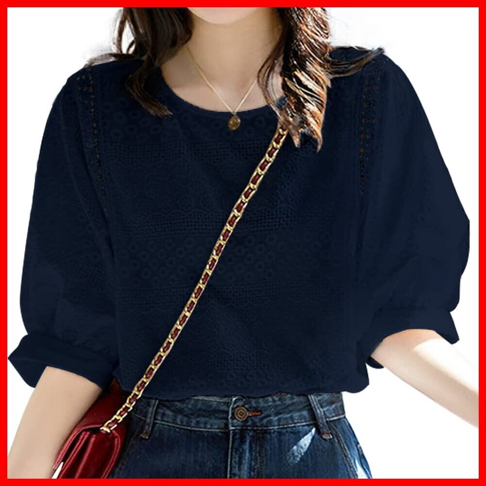 [Yino] (イノ) レース シャツ ブラウス レディース トップス 小花 刺繍 半袖 Uネック 透かし編み 着痩せ 可愛い おしゃれ ボリュームスリーブ 女性らしい カジュアル 通勤 デート お出かけ