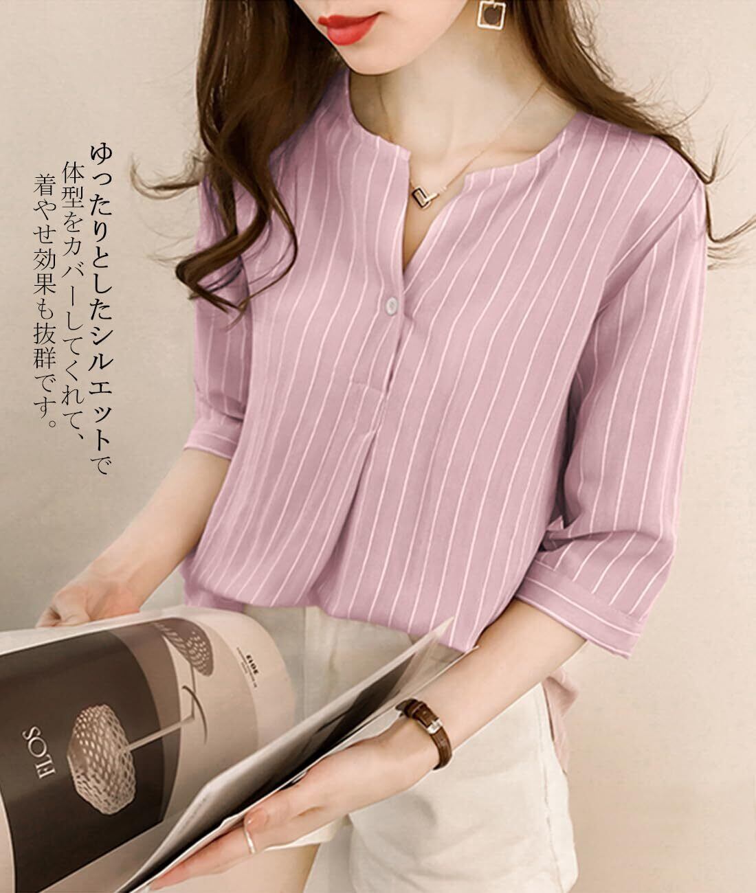 [Sueeya] スイーヤ シャツ レディース ブラウス ストライプ 半袖 スキッパー スリット ゆったり 体型カバー 着痩せ お洒落 可愛い 着回し 通勤 カジュアル プルオーバー トップス 春 夏
