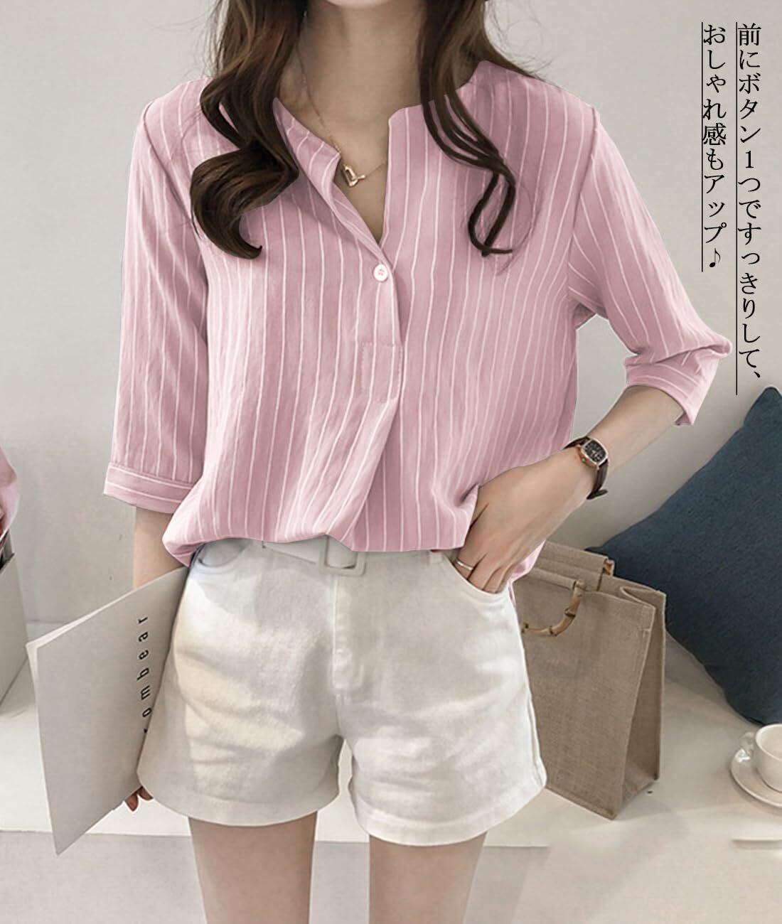 [Sueeya] スイーヤ シャツ レディース ブラウス ストライプ 半袖 スキッパー スリット ゆったり 体型カバー 着痩せ お洒落 可愛い 着回し 通勤 カジュアル プルオーバー トップス 春 夏