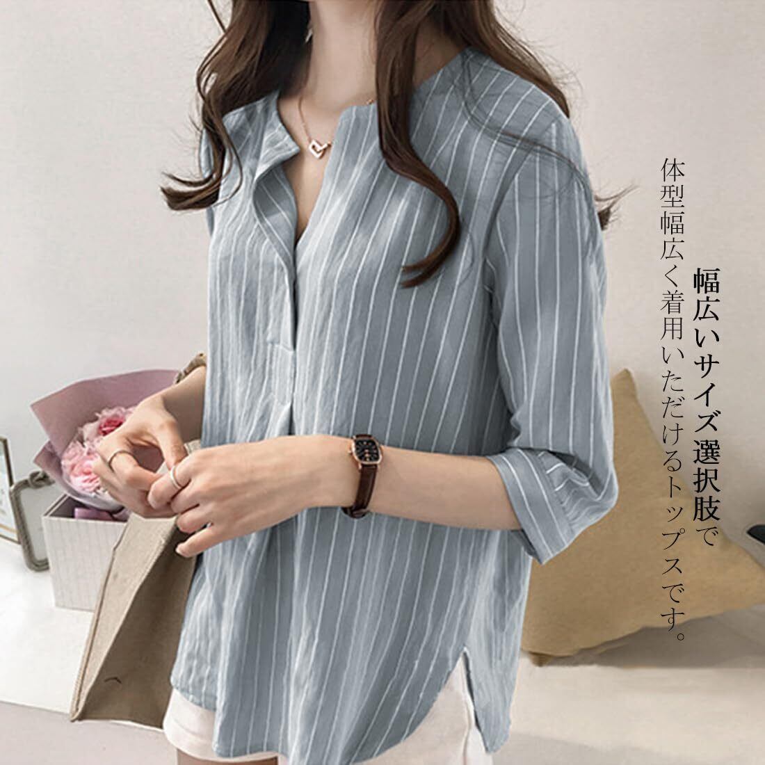 [Sueeya] スイーヤ シャツ レディース ブラウス ストライプ 半袖 スキッパー スリット ゆったり 体型カバー 着痩せ お洒落 可愛い 着回し 通勤 カジュアル プルオーバー トップス 春 夏