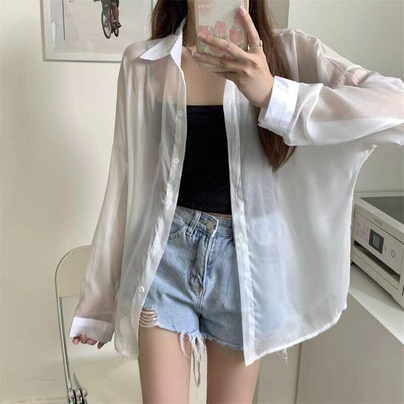 [Xingsas] シアーシャツ 透け感 レディース日焼け止め 上着 日焼け止め シャツ 透けシャツ 長袖上着 シャツ 前開きシャツ 重ね着 大きいサイズ トレンド 白 カジュアルファッション ゆったり涼しい 夏 春 秋 ライトブルー