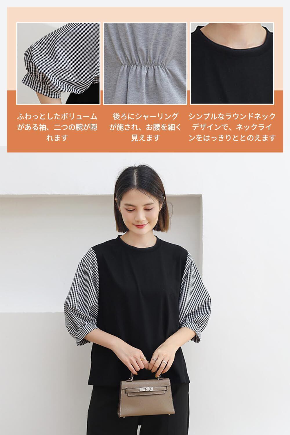 【オシャレなデザイン】パフスリーブ、チェック柄の切り替えがデザインパッと目を惹くポイントになっています。ゆったりとした七分袖が軽やかな印象を与えて、気になる両腕を隠すこともできます。ブラウスの背面はゴムがあり、余計なゆったりを縮め、視覚的にスリムになる。
