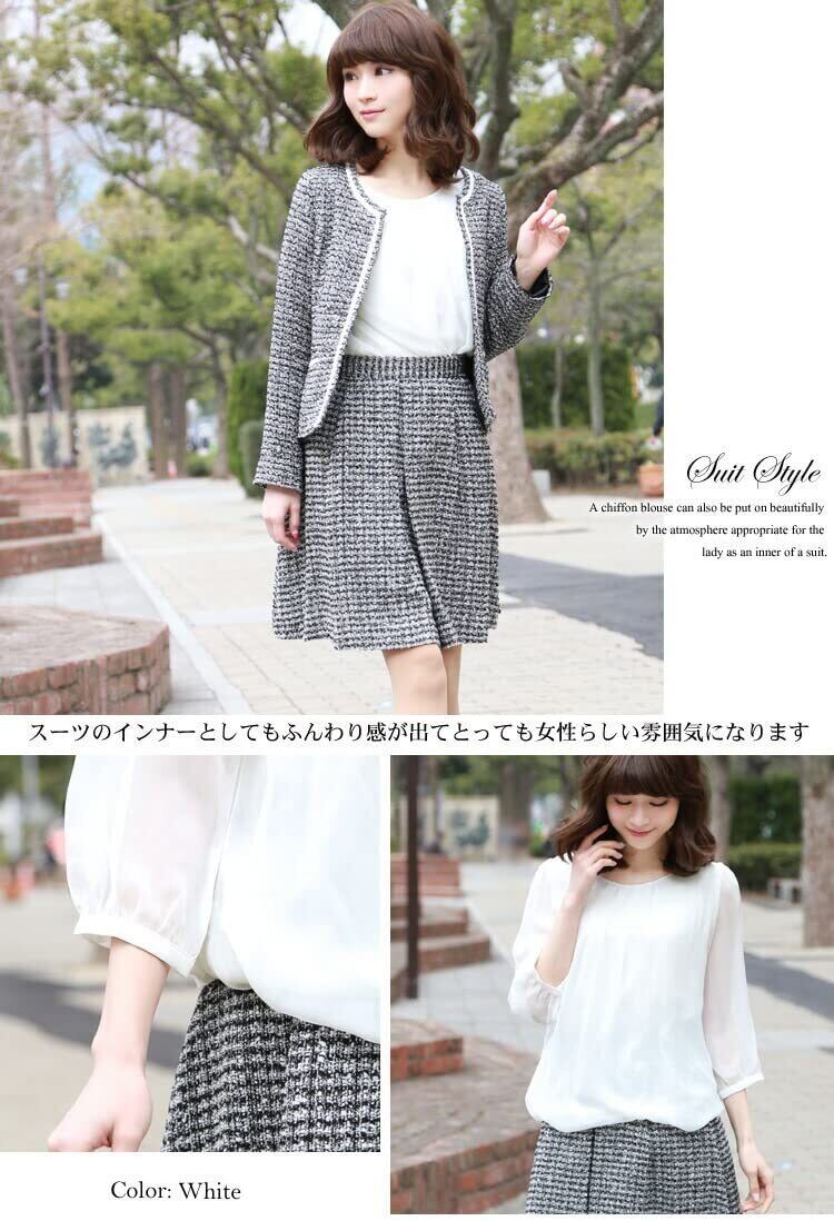 ブラウス レディース フォーマル バルーン オフィス カジュアル スーツ インナーブラウス シフォン 天竺 フロントタック 七分袖 無地 クルーネック ふんわり ビジネス 入学式 入園 卒業 卒園 七五三 白 母 ママ