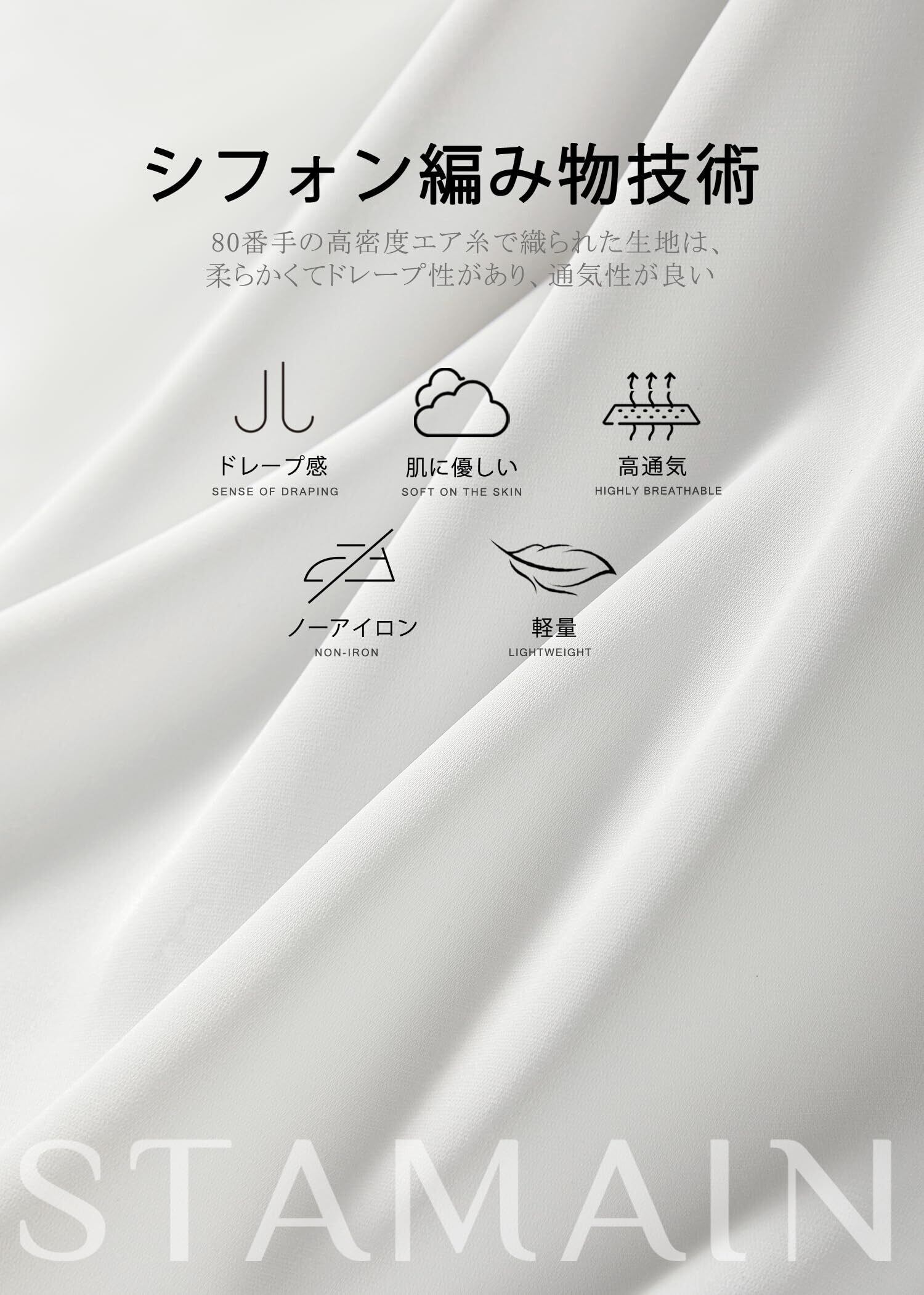 「ドレープ感」軽やかで柔らかくさという特性を持っており、まるで"人体の第二の肌”のように。快適さとフィット感の点では、肌とのシームレスなフィットを実現。