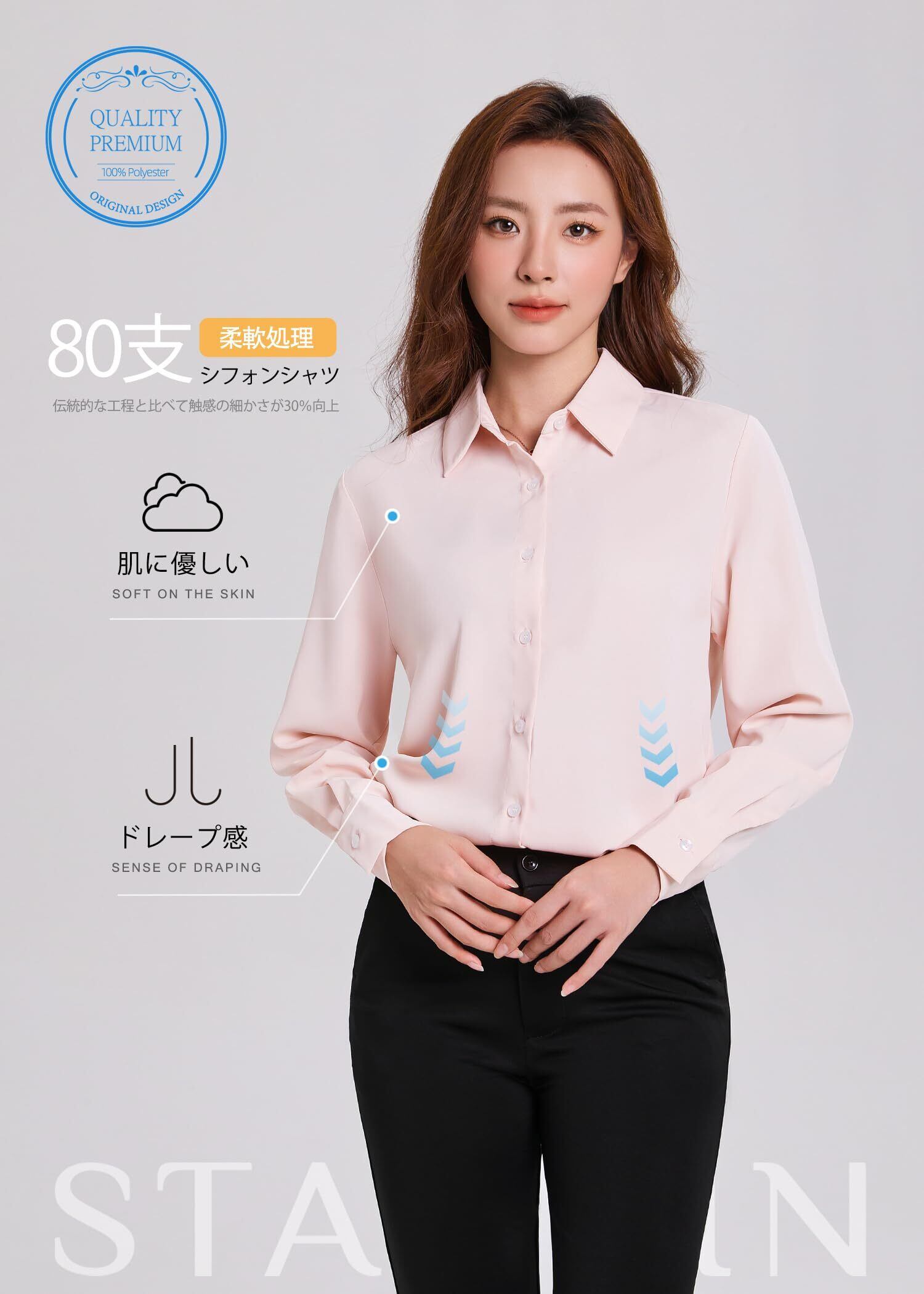 [Stamain] 新登場!ZL1665「シフォン」接触冷感 柔らかい UV防止 UPF50+ 高通気 ドレープ感 オフィス レディース 通勤 事務服 就活 きれいめ かわいい 高级 シャツ 長袖 ゆったり/80番手/192g
