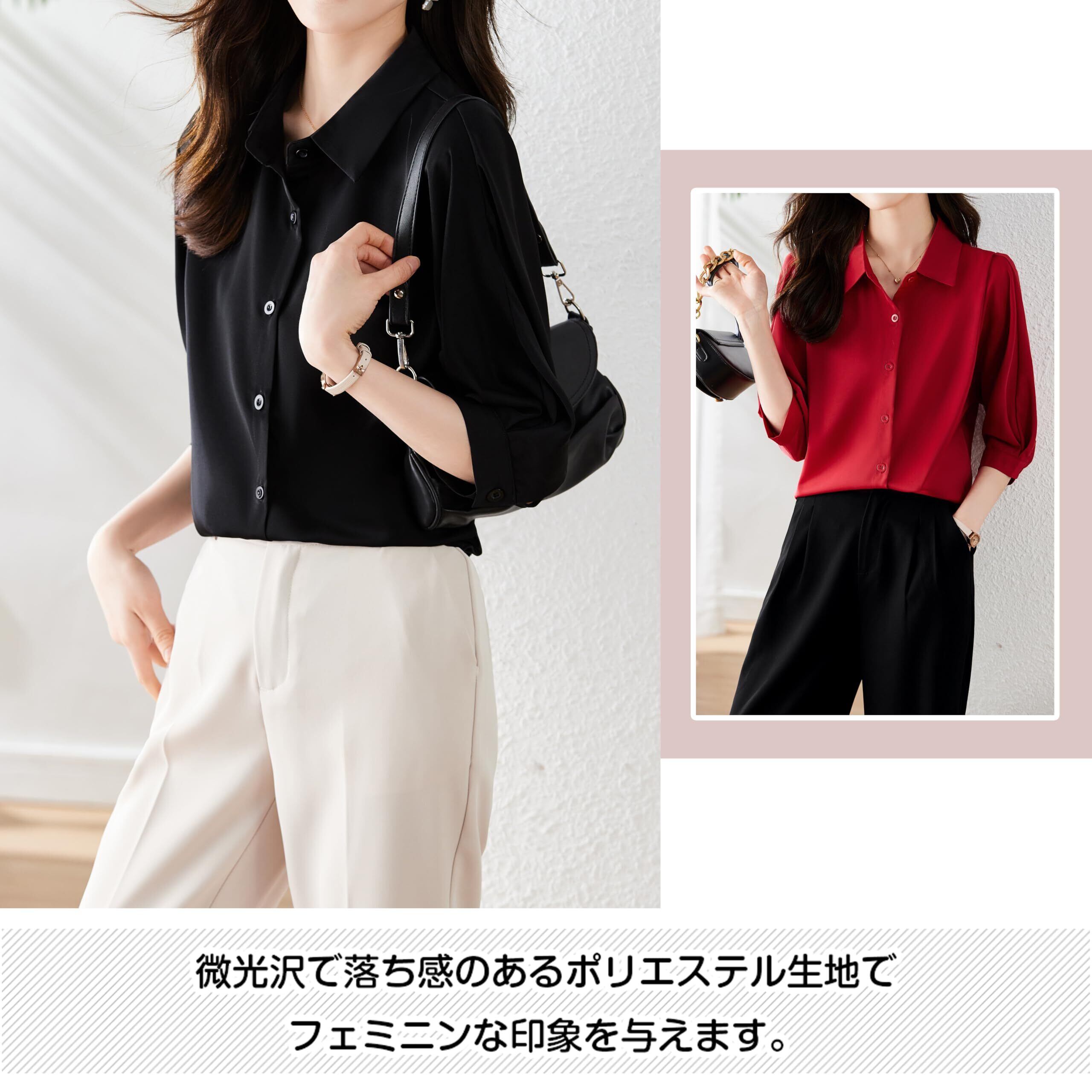 [Bolan Verl] 【 8色 】 レディース 七分袖 ブラウス 薄手 シャツ オフィス 襟付き トップス ドルマン 女性 白 黒 赤 ピンク 緑 夏 春秋 前開き 襟付き カジュアル 通勤 お出かけ