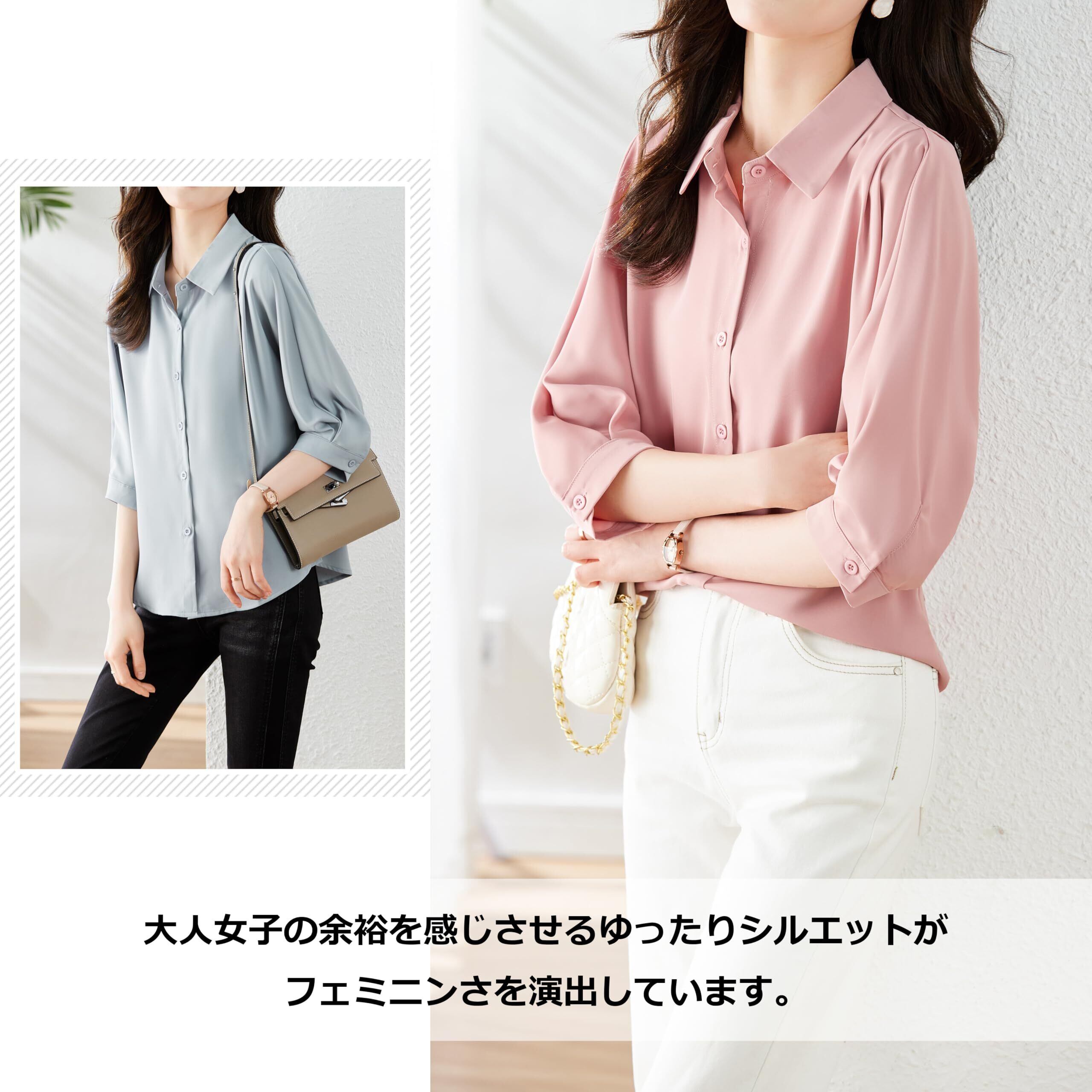 [Bolan Verl] 【 8色 】 レディース 七分袖 ブラウス 薄手 シャツ オフィス 襟付き トップス ドルマン 女性 白 黒 赤 ピンク 緑 夏 春秋 前開き 襟付き カジュアル 通勤 お出かけ