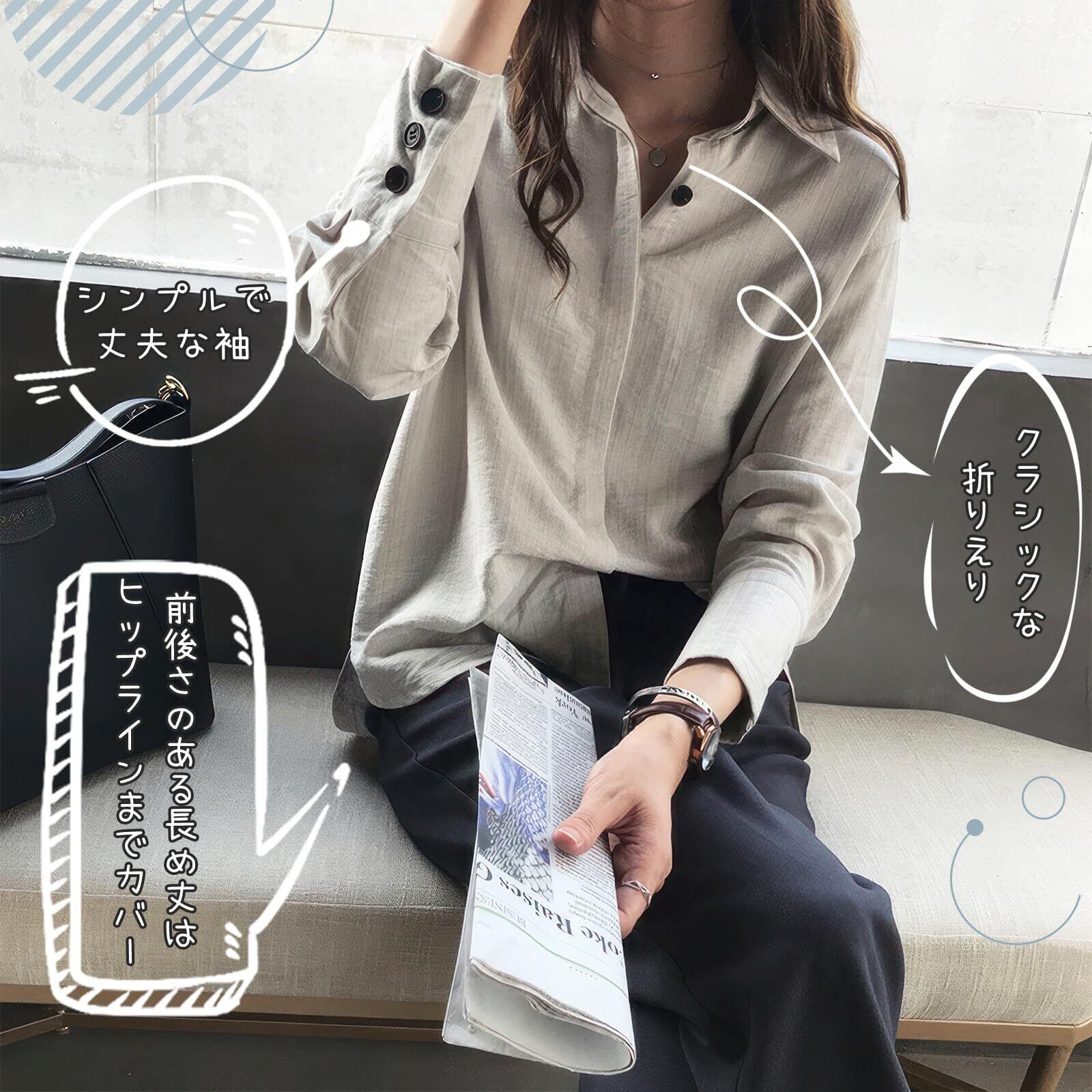 【着回し力抜群なブラウス】袖口に複数のボタンや前後差のあるラウンドへムなどデザインを効かせた長袖シャツは1枚ではもちろんレイヤードにもおすすめです。ニットベストやジレなどにレイヤードして、体型カバーしつつ、着痩せ見えするコーディネートに仕上げてくれます。流行に左右されにくいベーシックなデザインなので、長く愛用できます。カジュアルなダメージデニムから女性らしいフレアスカートまで、幅広いボトムスとマッチ。ジュアルやフォーマルシーンにもぴったり。
