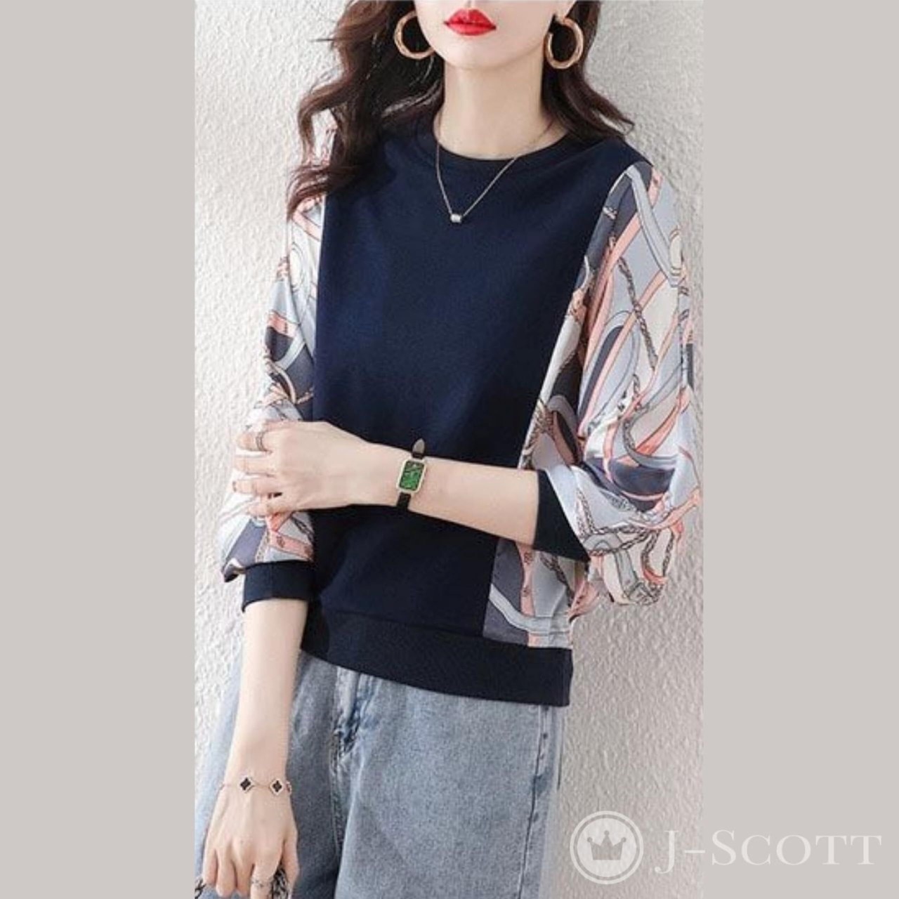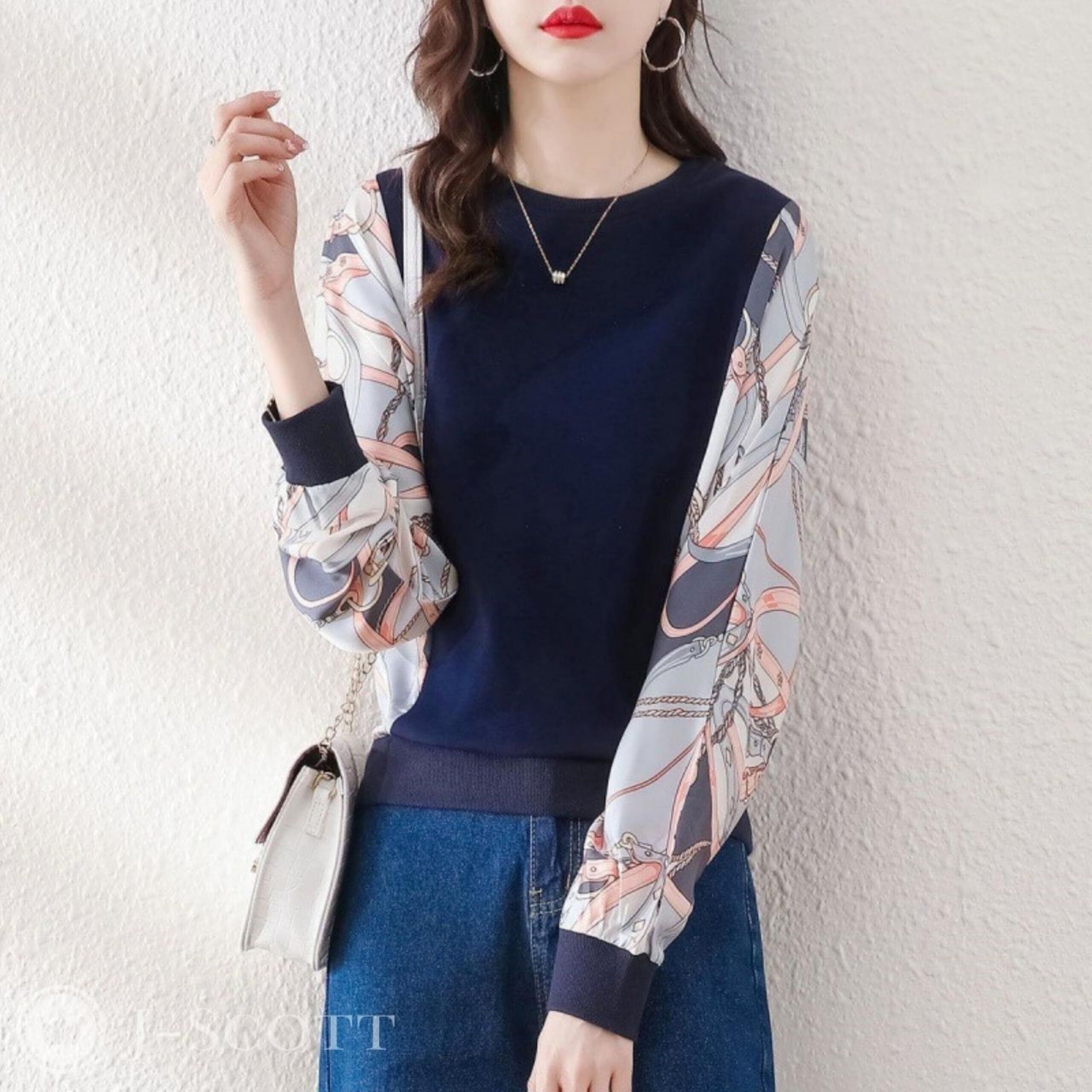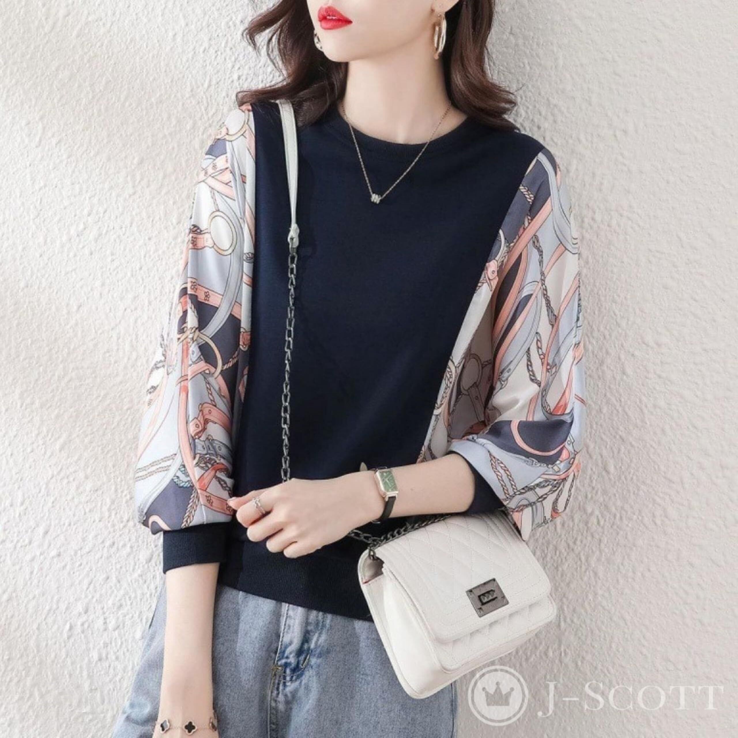 [J-Scott] プルブラウス レディース スカーフ柄スリーブ 異素材ミックス ラウンドネック ドルマンスリーブ 長袖ゆったり エレガント JS16