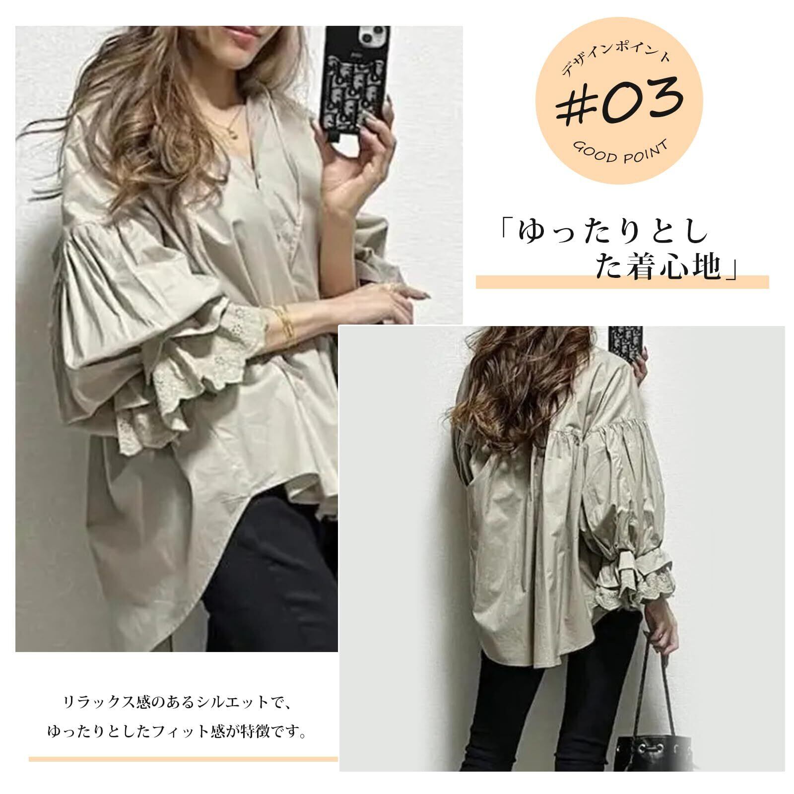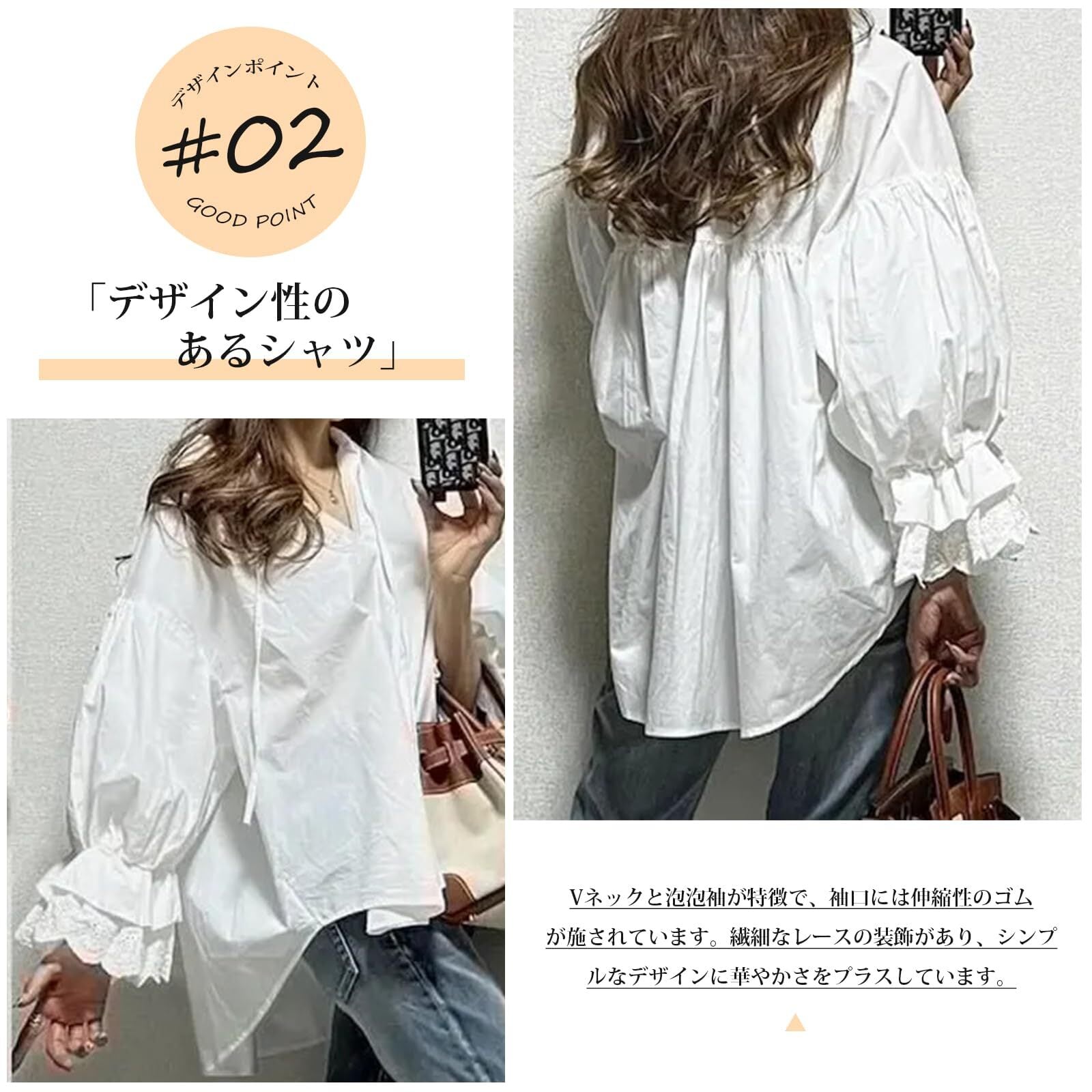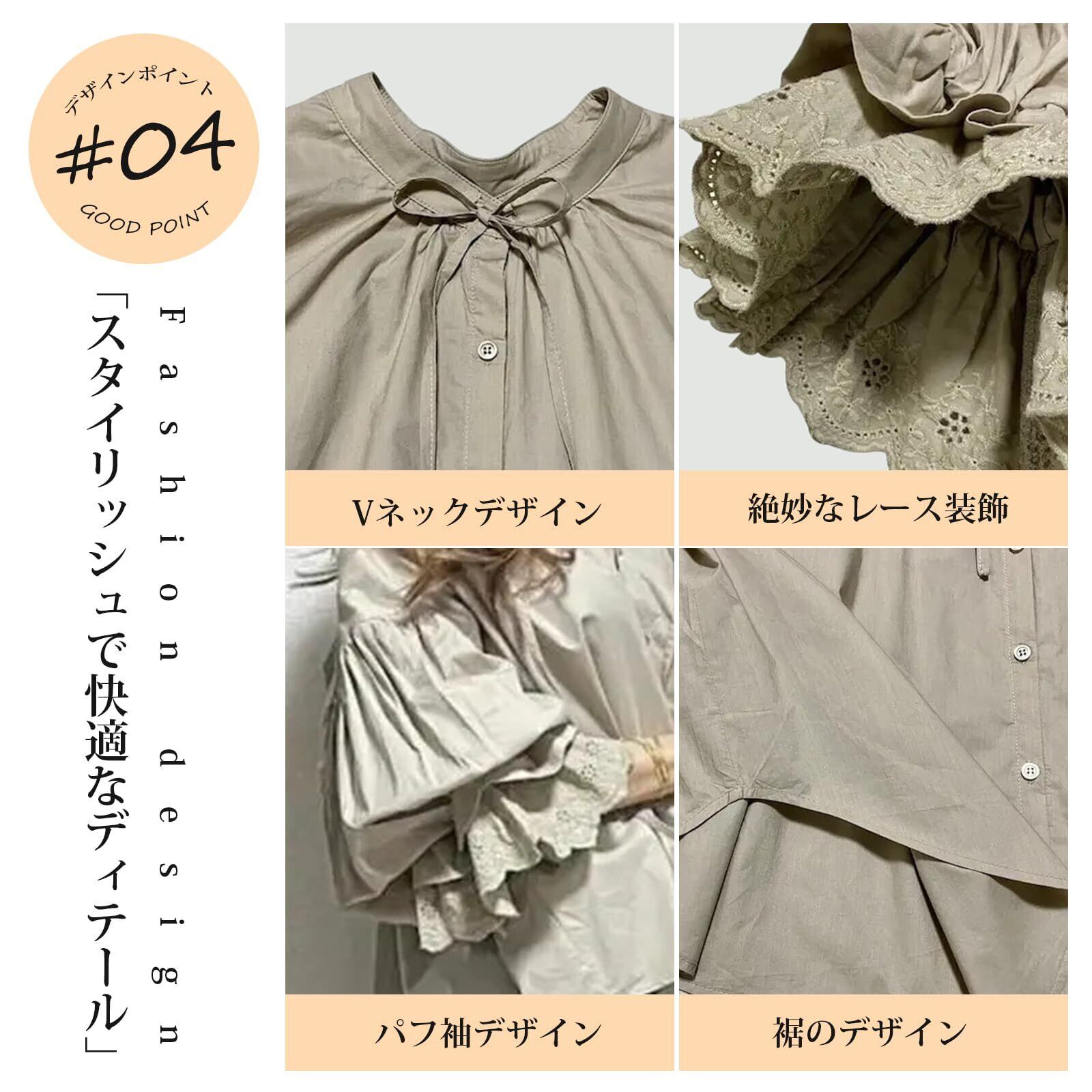 【デザイン性のあるシャツ】Vネックと泡泡袖が特徴で、袖口には伸縮性のゴムが施されています。繊細なレースの装飾があり、シンプルなデザインに華やかさをプラスしています。襟元の飾り紐と前面のボタンがアクセントになり、実用的でありながらエレガントな印象を与えます。