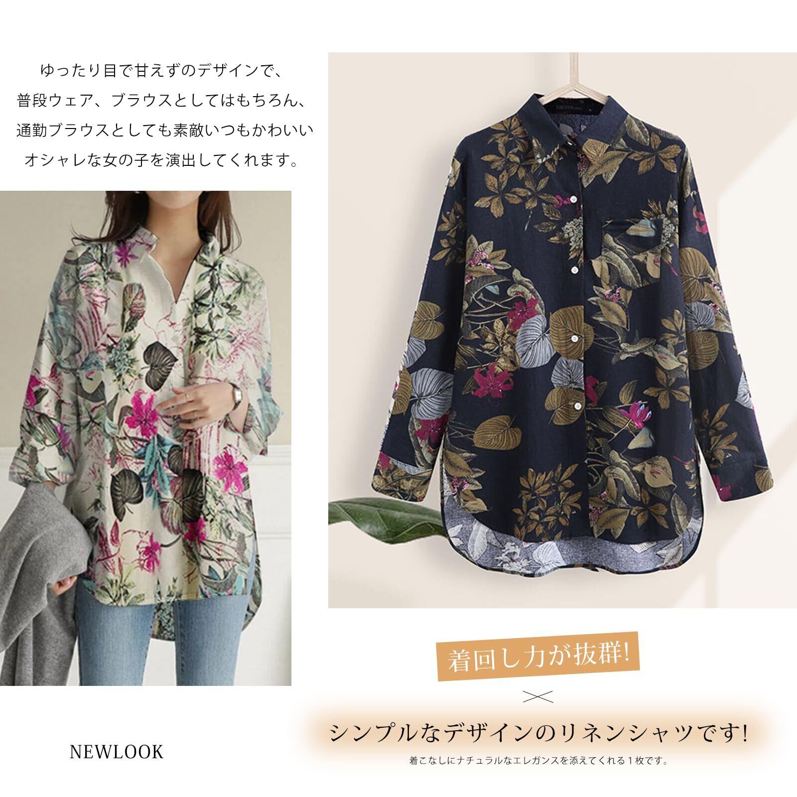 [Leadamon-oee] ブラウス レディース 綿麻 シャツ 花柄 トップス 長袖 リネンシャツ 前開き 襟付き スリット ワイシャツ ゆったり 大きいサイズ 冷房対策 おしゃれ 通勤 春 夏 秋