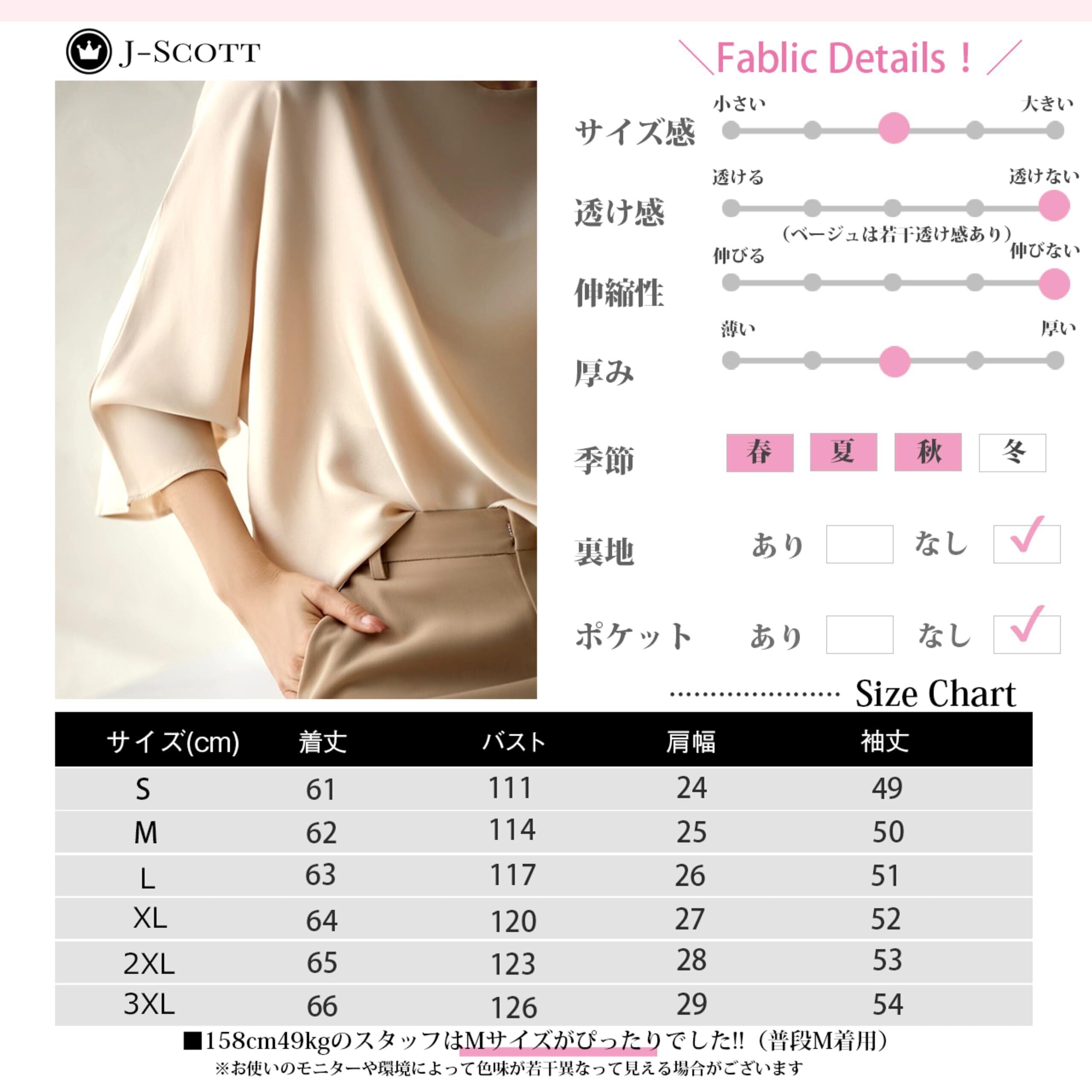 [J-Scott] とろみブラウス レディース 七分袖 ラウンドネック シルキータッチ 無地 プルオーバー エレガント サテン風 ゆったり JS12