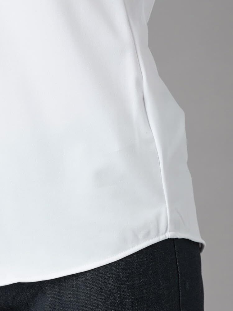 こだわりの日本製生地はソフトなポリエステルニットで、スポーツウェア等にも使われる高機能防汚素材。体の動きに合わせて生地が伸び縮みする高いストレッチ性が特徴で、動作時の負荷が少なく、さらに汗による生地の張りつきを防ぐ肌離れ効果でさらっとした着心地を維持し、着用ストレスを軽減します。完全ノーアイロン、ストレッチ、吸水速乾、消臭の機能で快適な着心地やイージーケア性に優れています。