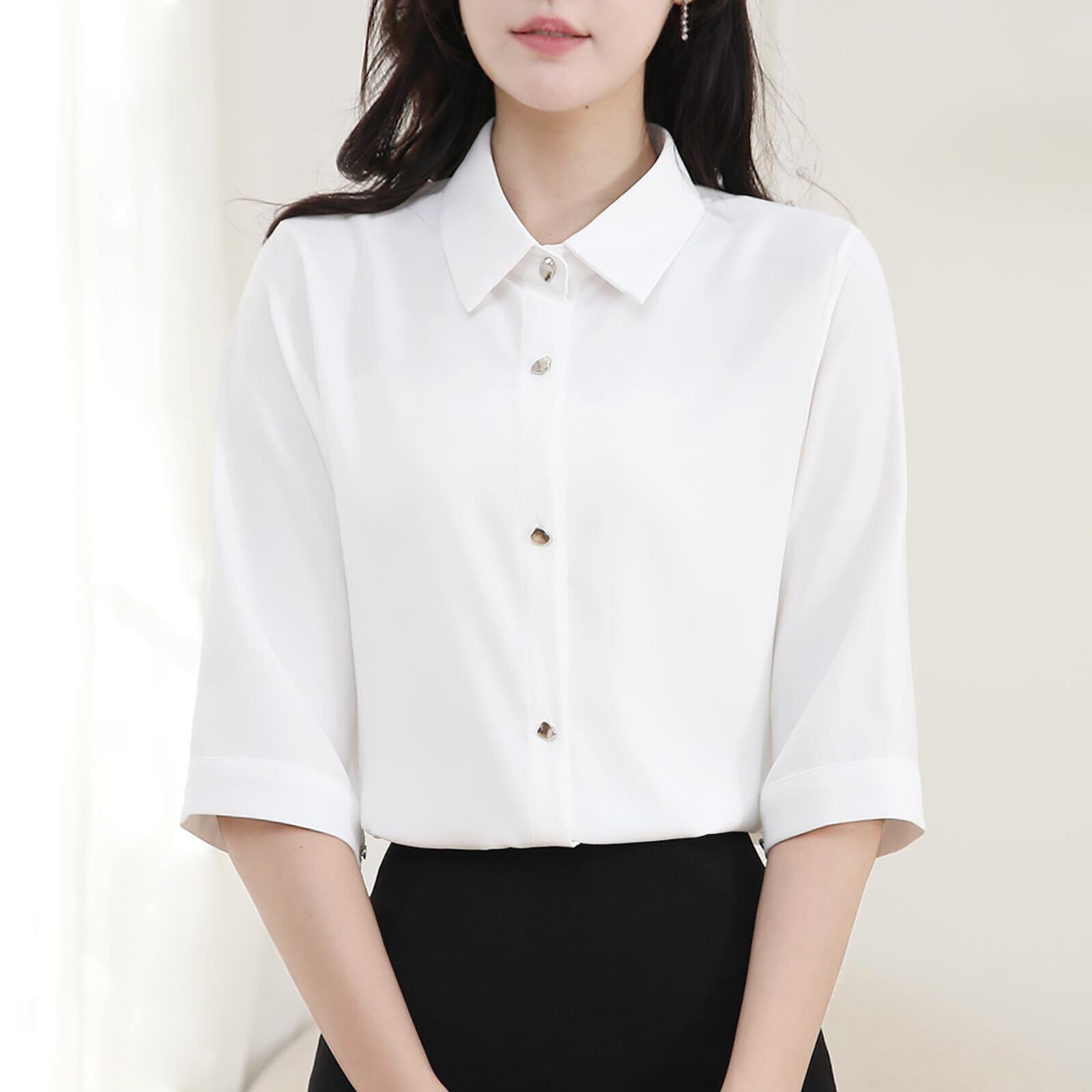 デザインポイント:シンプルでもバイカラーの配色がアクセントになるレディース半袖シャツです。フロントに付けた釦が少し変わっていてシルバー系のデザインで目を惹いて、おしゃれで華やかな雰囲気が溢れて来ます。ご注意:釦は菱形に近似した形で、釦の狭い方をボタンホールに合わせて掛けたり解けたりしやすくなりますので、お気になる方は予めご了承ください。顔周りをすっきり見せる折り襟で、きれいめで大人の抜け感が生まれているレディースブラウスです。襟付きのデザイン、カジュアルにもフォーマルにもご愛着いただけます。