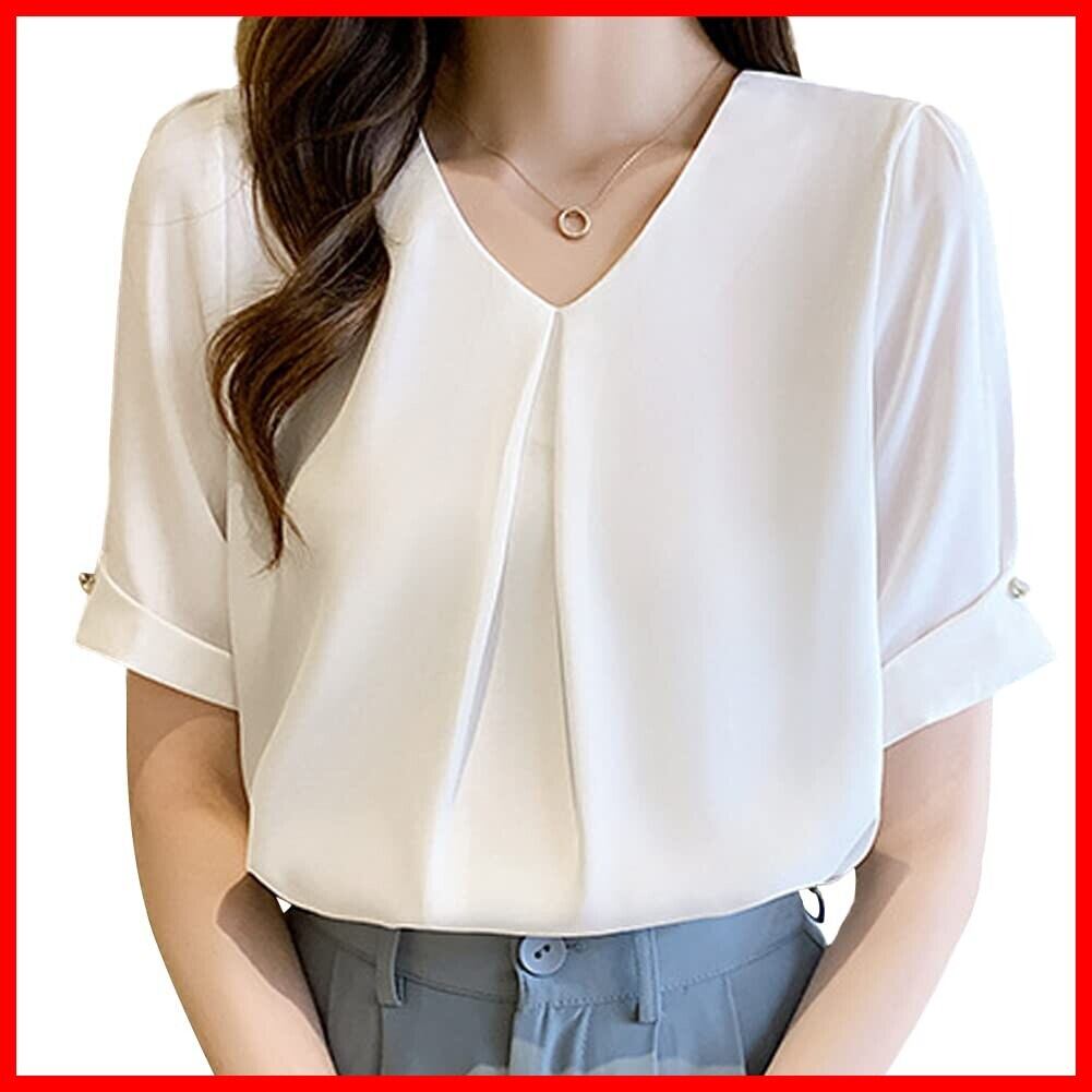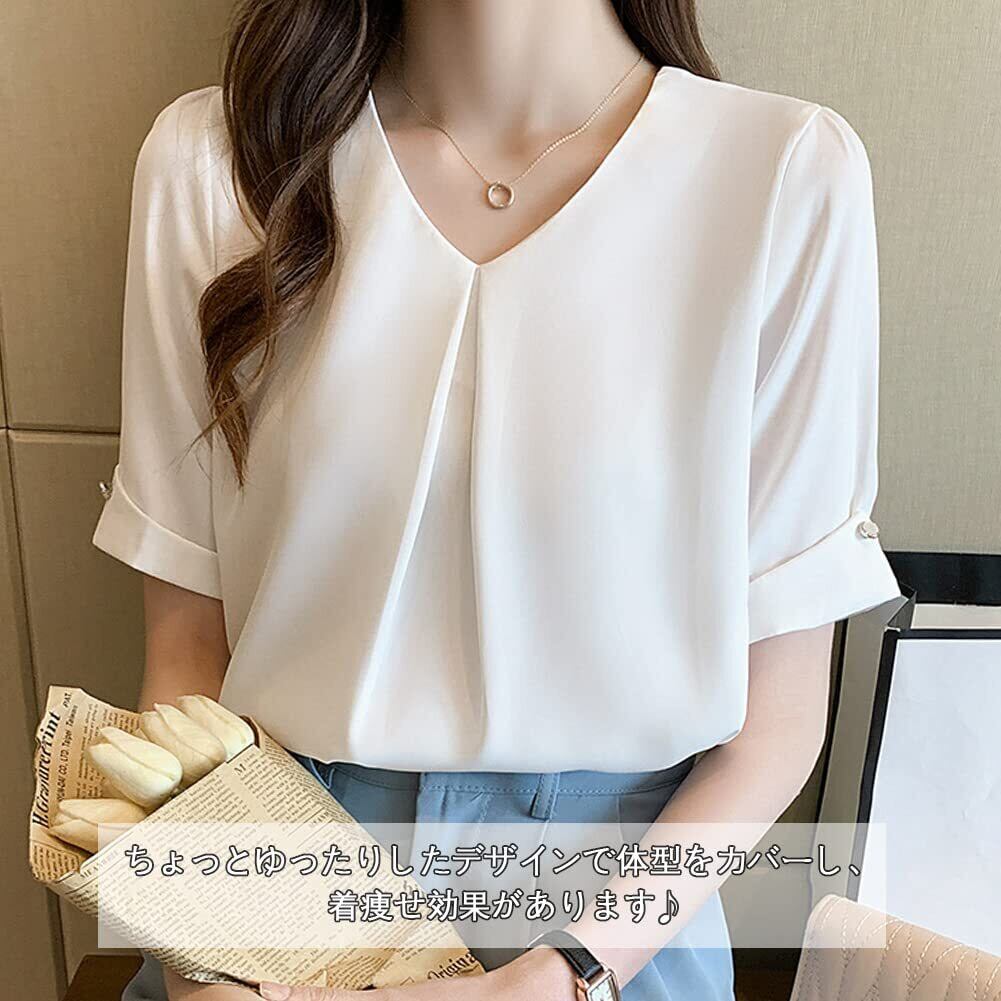 [Bidason] ブラウス レディース 半袖 シフォン シャツ Vネック 夏 ゆったり 着痩せ タック カジュアル 体型カバー きれいめ お洒落 可愛い スッキリ 洗える トップス 通勤 デート 夏