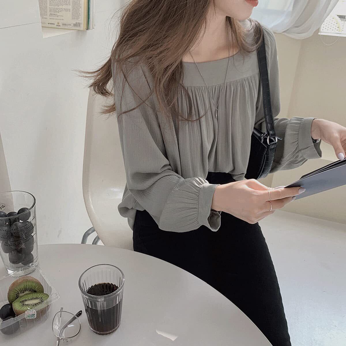 [SYitong] とろみ シャツ トップス 女性 長袖 シフォン 薄手 レディース ブラウス 韓国 大人 可愛い ブラウス 長袖 春 秋 スクエアネック オフィス 通勤 通学 OL カジュアル トップス 春服 おしゃれ 着痩せ ゆったり