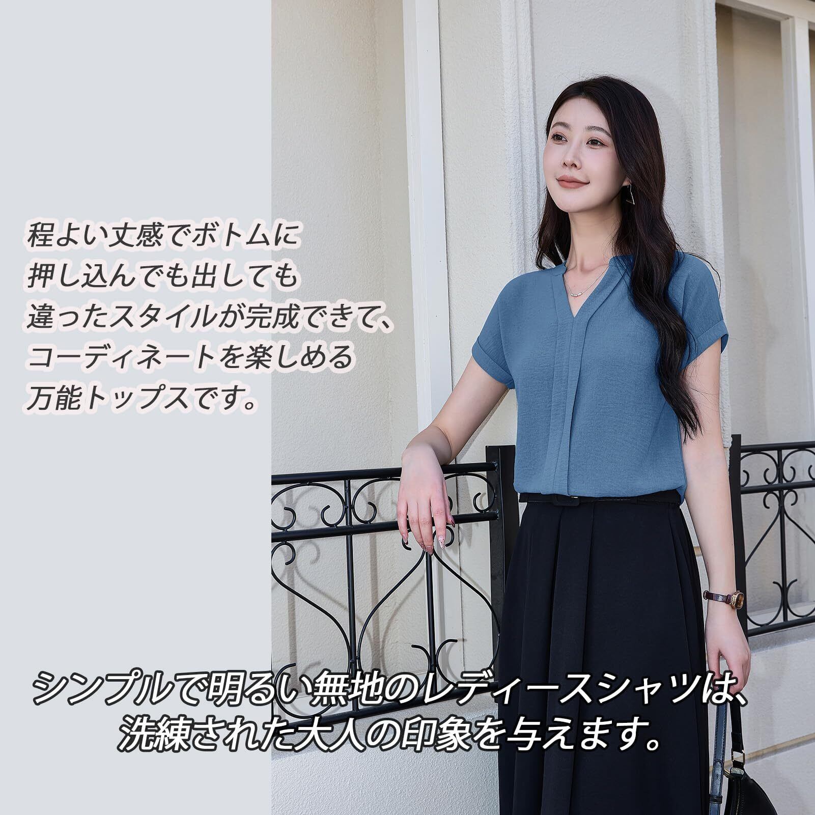 [Hotouch] ブラウス レディース 半袖 Vネック シフォン トップス シャツ 夏 薄手 通気性 無地 シンプル 体型カバー 着痩せ 柔らかい ゆったり おしゃれ UV防止 通勤 デート オフィス カジュアル フォーマル ビジネス スーツ インナー