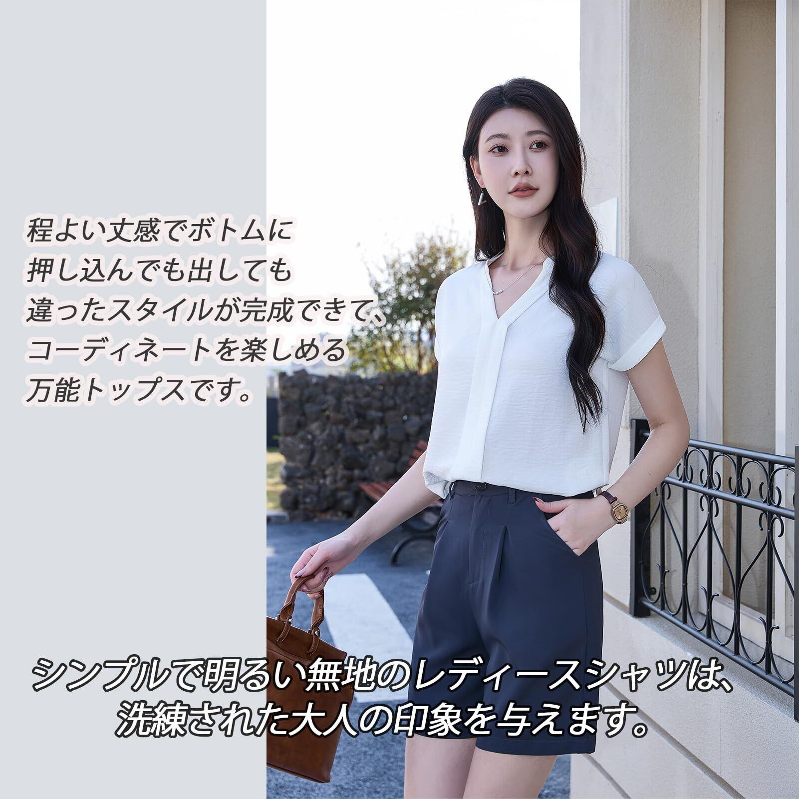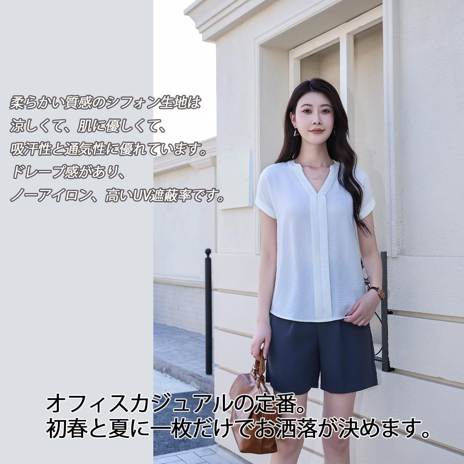 [Hotouch] ブラウス レディース 半袖 Vネック シフォン トップス シャツ 夏 薄手 通気性 無地 シンプル 体型カバー 着痩せ 柔らかい ゆったり おしゃれ UV防止 通勤 デート オフィス カジュアル フォーマル ビジネス スーツ インナー