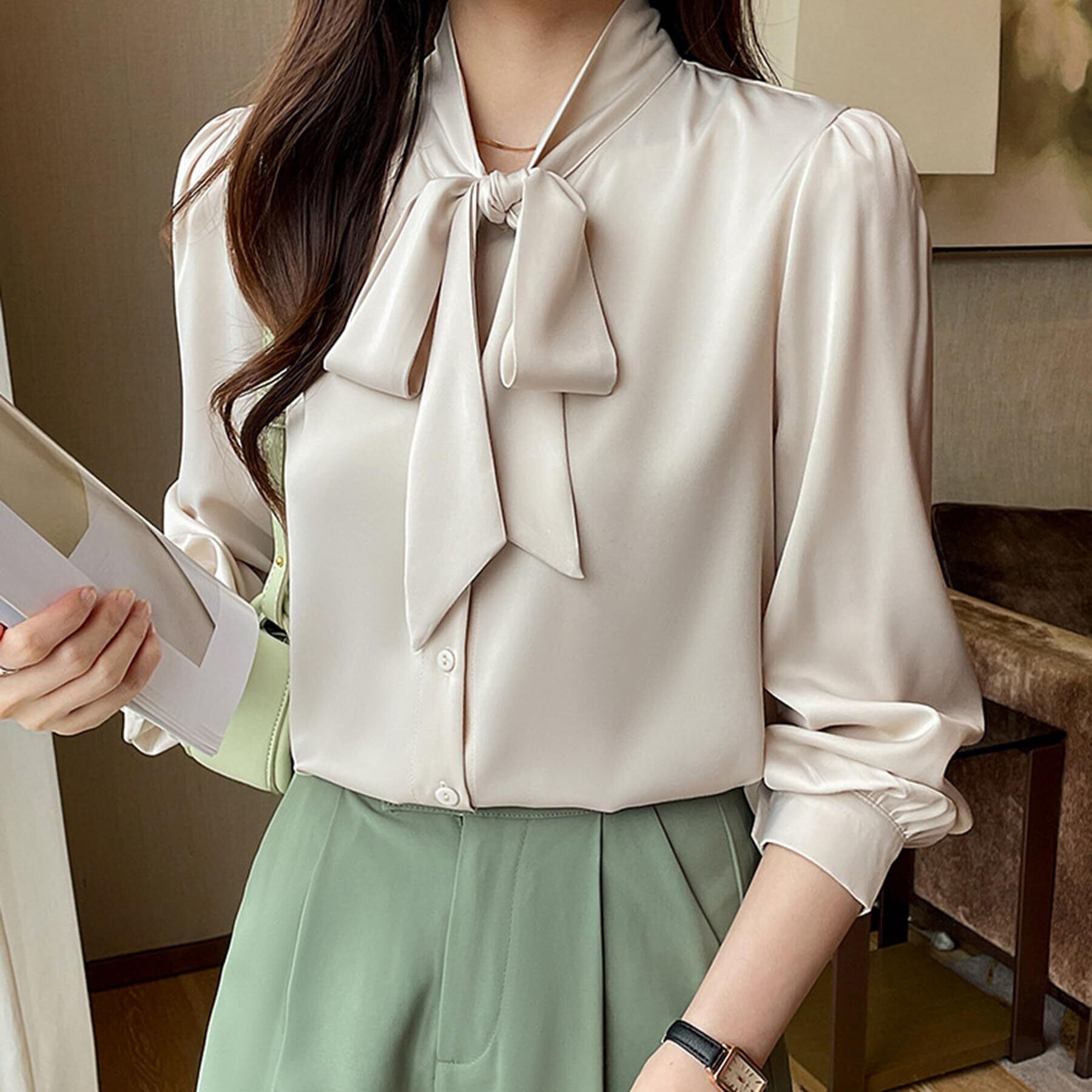 [Lalapala] シャツ ブラウス レディース 長袖 シフォン リボン ブラウス ボウタイブラウス 爽やか トップス おしゃれ 大きいサイズ ボウタイ リボンブラウス カジュアル オフィス 通勤 春 白 ゆったり きれいめ 着痩せ