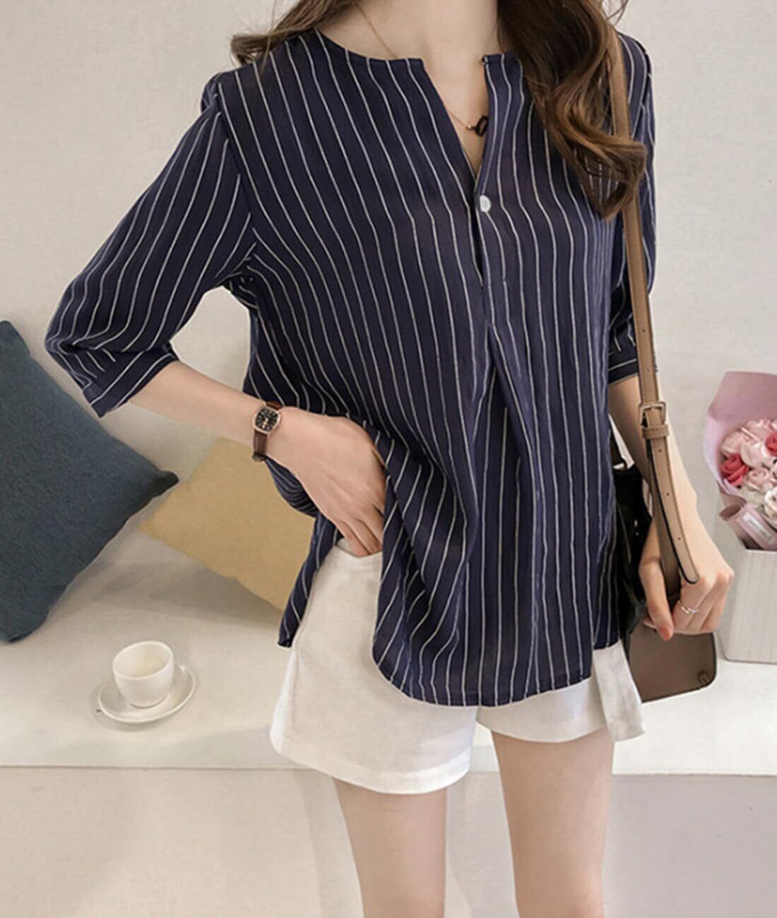 [Sueeya] スイーヤ シャツ ブラウス レディース ストライプ スリット 七分袖 ゆったり 大きいサイズ プルオーバー トップス お洒落 可愛い カジュアル ファッション 通勤 日常 夏 秋