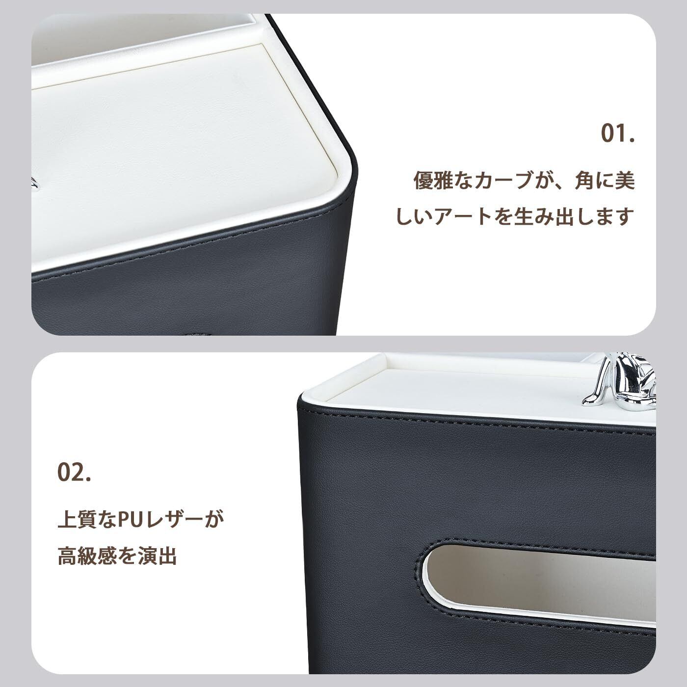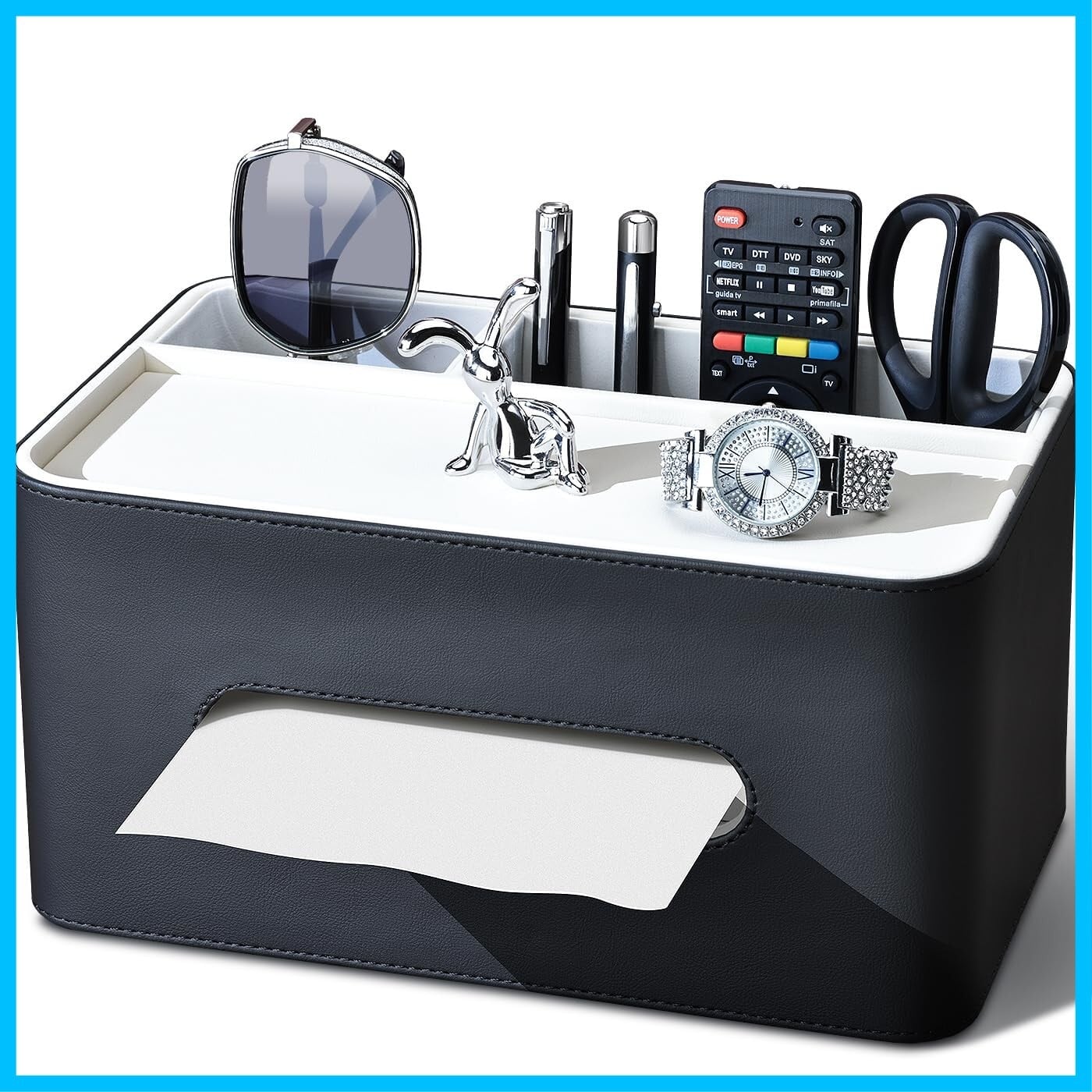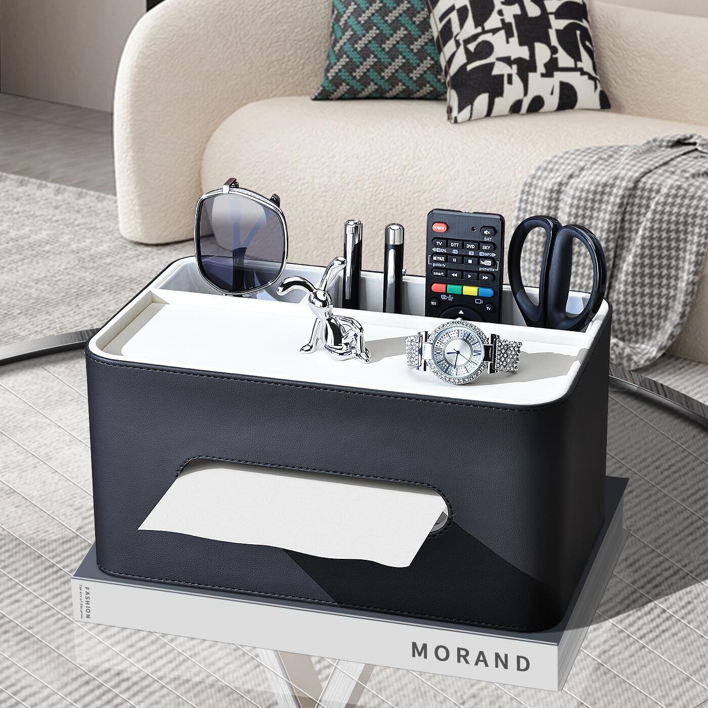KINGFOM ティッシュケース 高級PUレザー製 ティッシュボックス 卓上収納ケース リモコン収納ボックス多機能収納ケース デスクトップ収納 小物収納 ペン立て 北欧風デザインおしゃれで実用的な卓上ティッシュボックス (ブラック×ホワイト)
