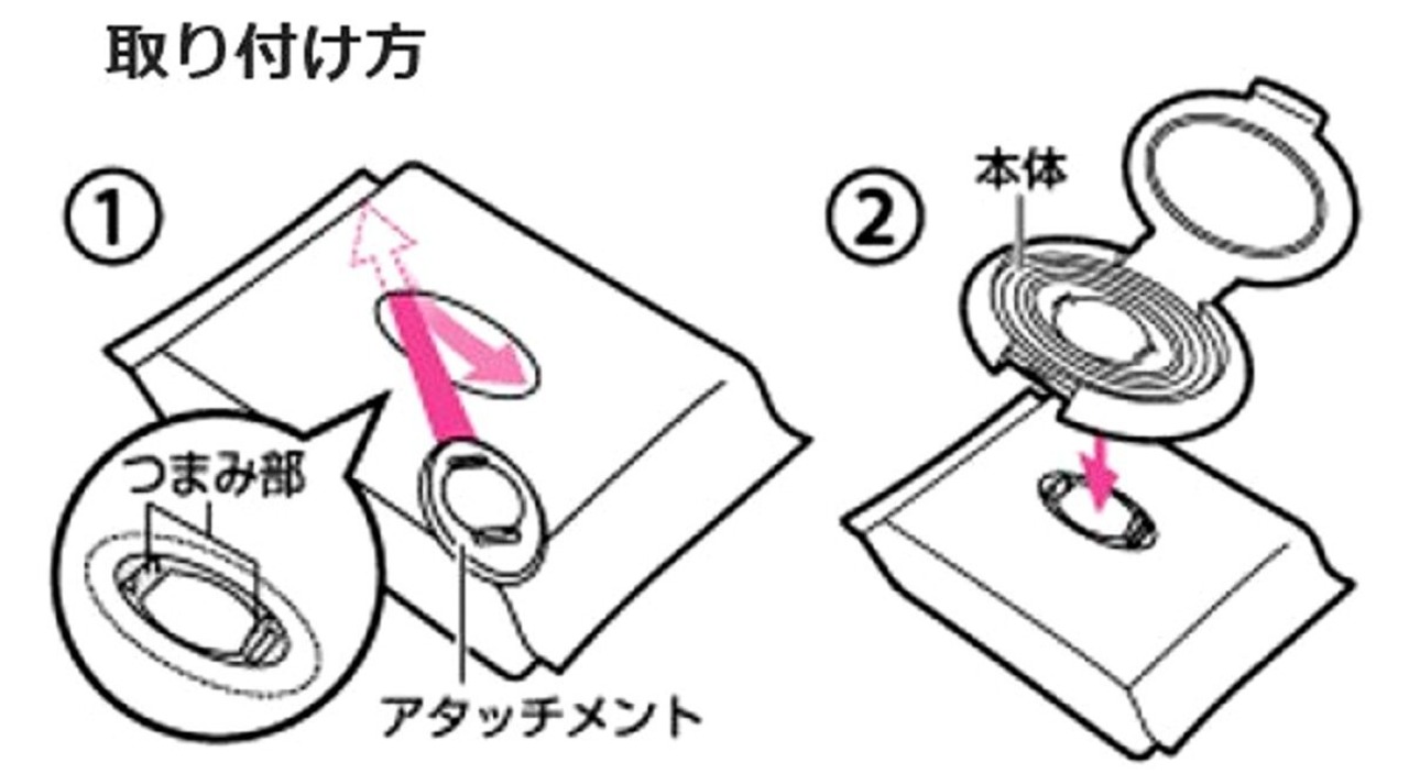 取り出し口長辺サイズ39mm以上と取り出し口長辺サイズ55mm以上の袋に入れられる、取り付け用アタッチメント2個付き