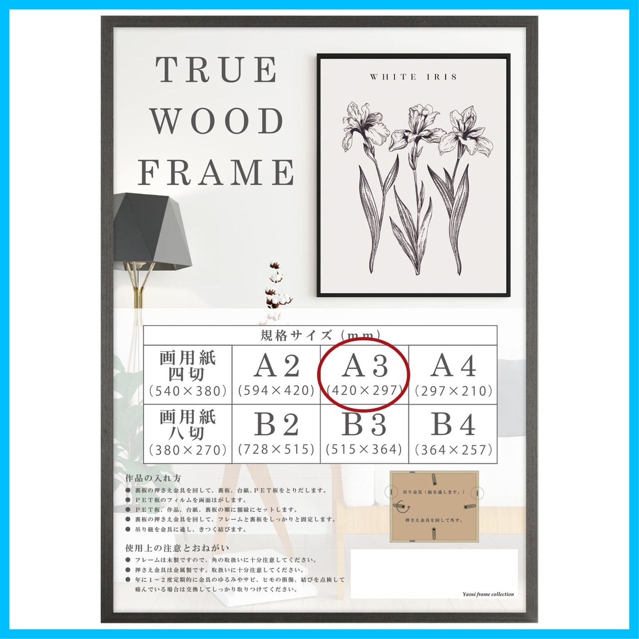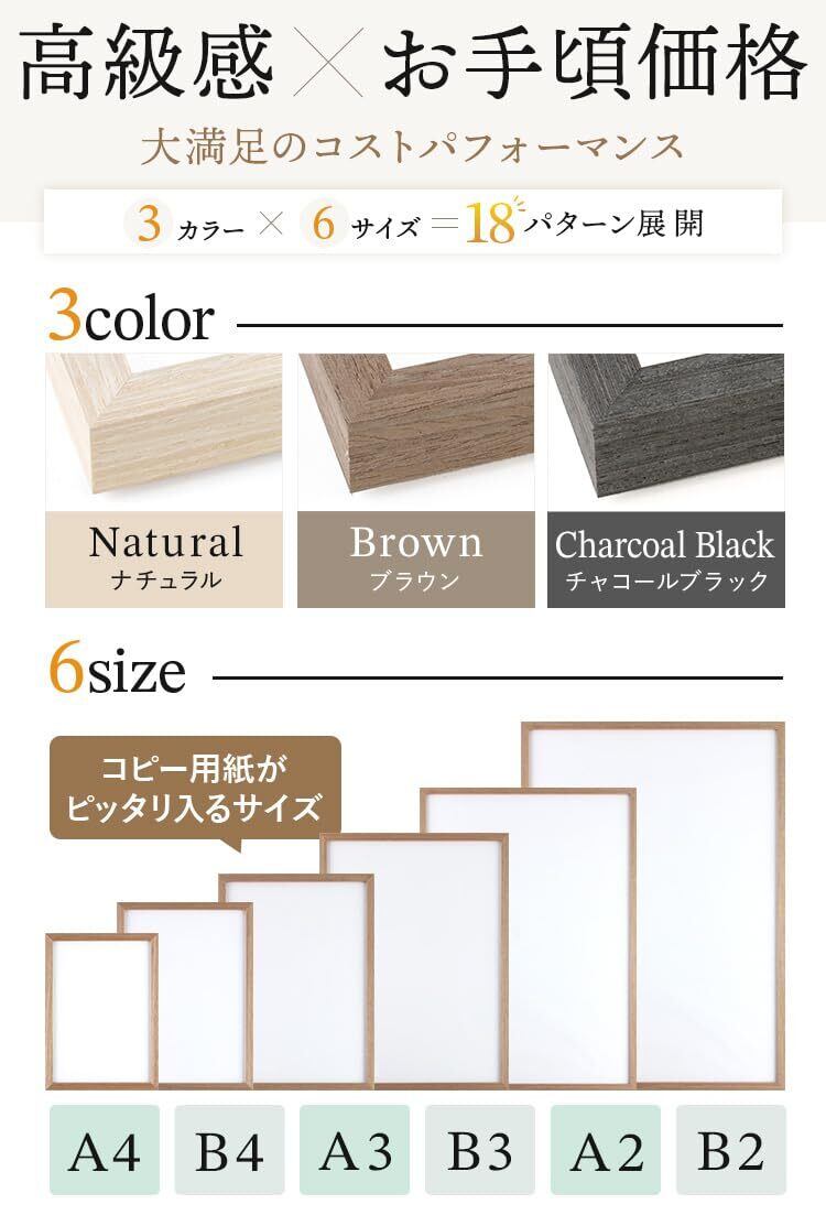 ■カラー:ナチュラル、ブラウン、ブラック ■梱包形態:箱無 OPP袋に入っております。 ■付属品:紐・吊り金具 ■素材:額(木製)、透明板(PET)裏板(MDF) ■取り扱い/注意事項:ダストカバーにPET板を使用しております。静電気により、埃が付着する事がございます。その際は乾いた柔らかい布で、埃を優しく拭き取ってください。濡れた布、固い布で、こすってしまうとPET板に傷がつく可能性がございます。 ■サイズ:コピー用紙専用フレーム (b2 a2 a3 a4 b3 b4 サイズ専用)
