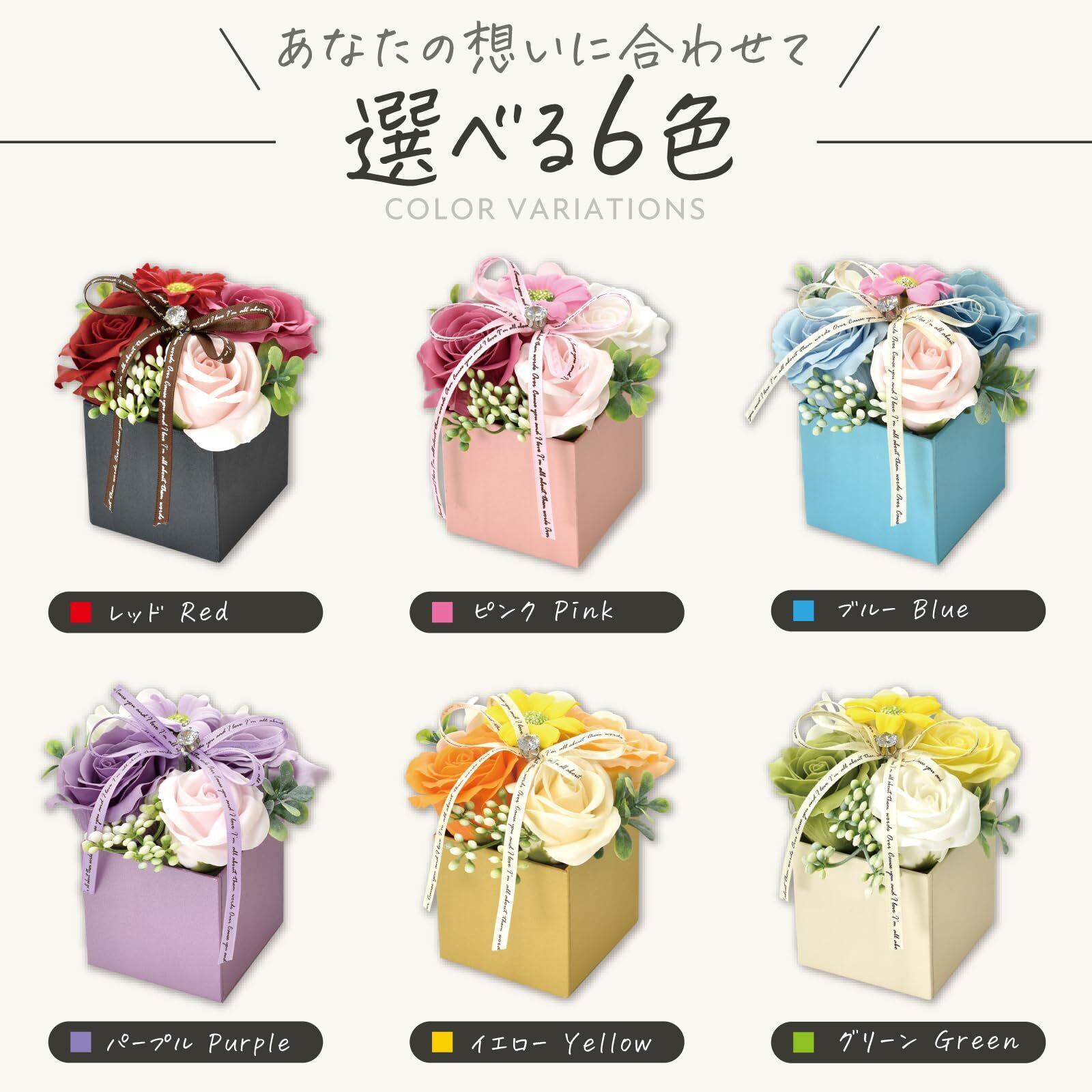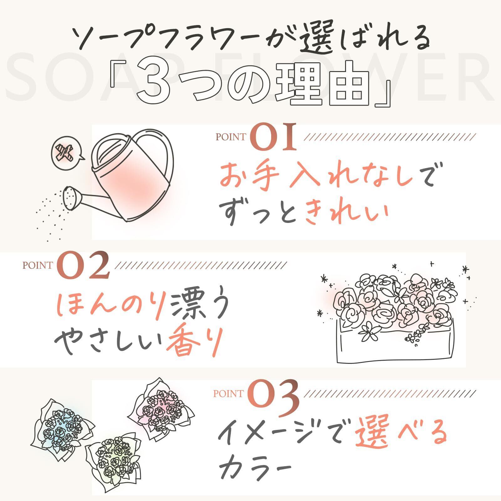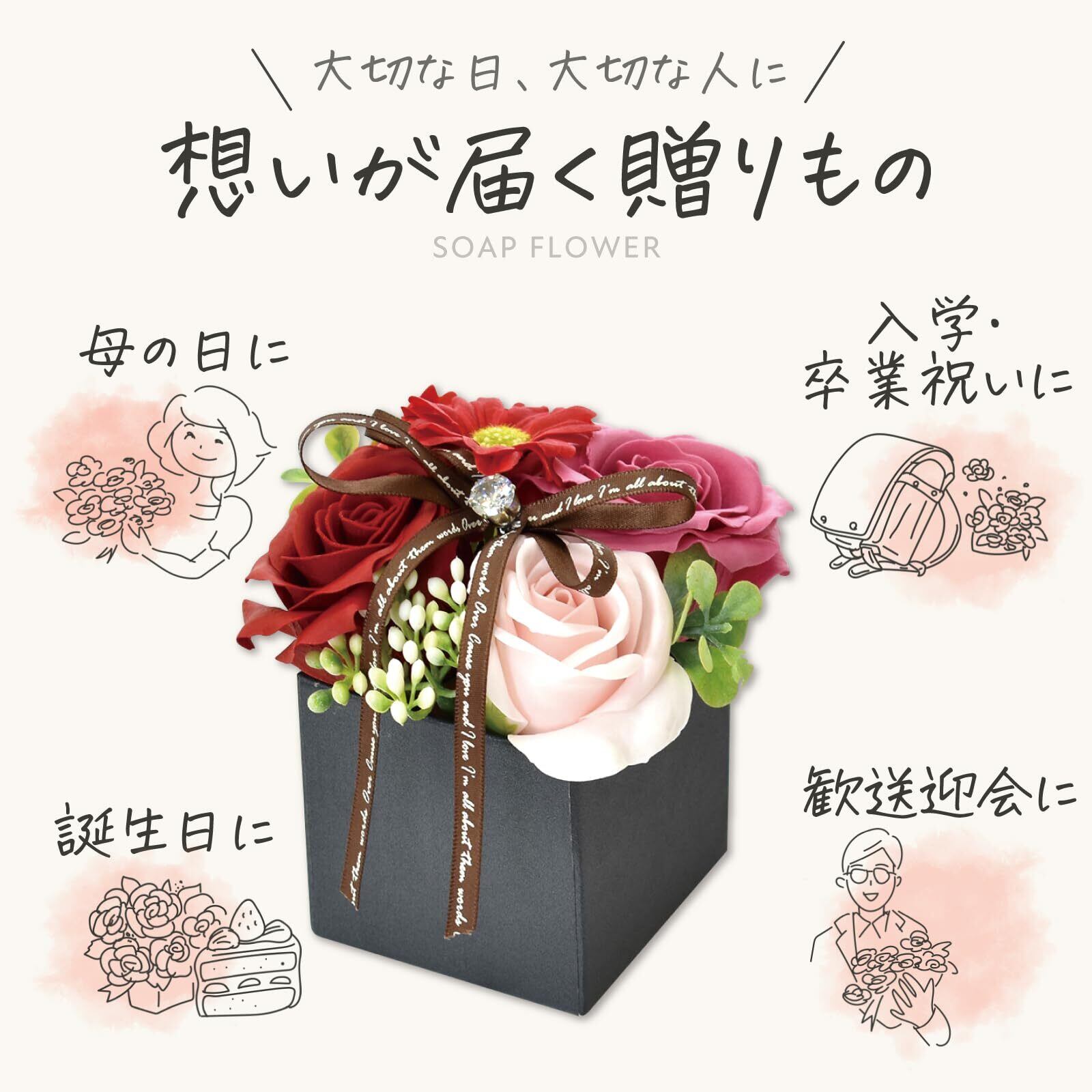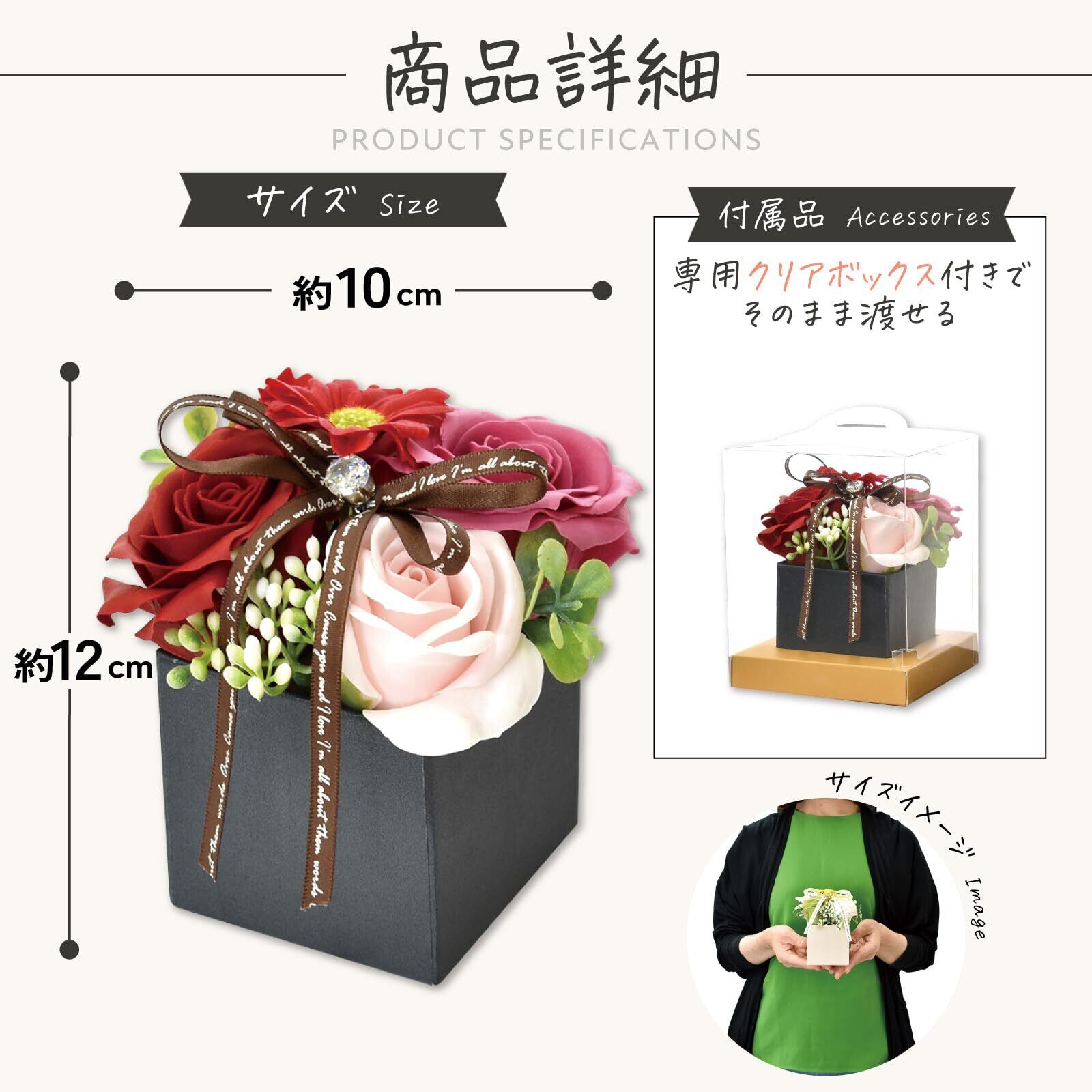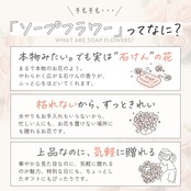 【ご使用上の注意】本商品は観賞用のソープフラワー(造花)です。石鹸として身体を洗う用途や、入浴剤としてのご使用はできませんのでご注意ください。また、小さなお子様やペットが誤って口に入れないよう、必ず手の届かない場所に保管してください。誤飲・誤使用を防ぐためにも、用途をご理解のうえ安全にお取り扱いください。※ご使用環境や個人差により、香りの感じ方には差があります。