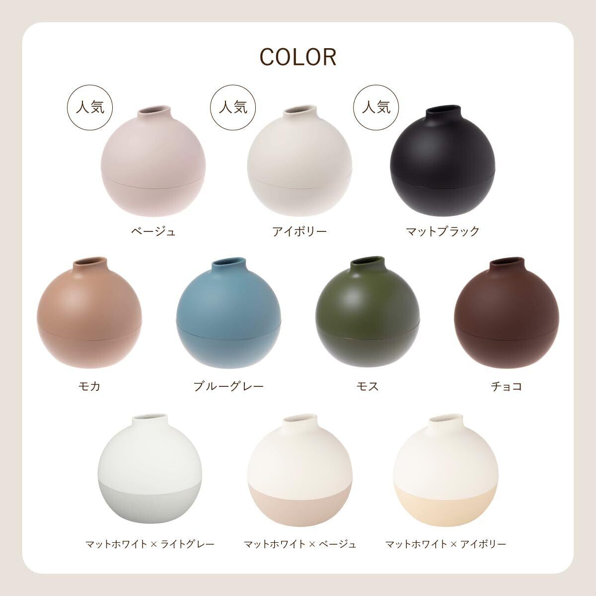 丸みを帯びたやさしい形状と、アイボリーやブラウンなどのやわらかな色合いはゆっくり体と心を休めたい寝室に置くとゆったりと落ち着いた気持ちで過ごせます。イエロー、オレンジ等鮮やかなビタミンカラーなど、一日の始まりにふさわしい、エネルギッシュなカラーを置いて朝のエネルギーチャージにも。