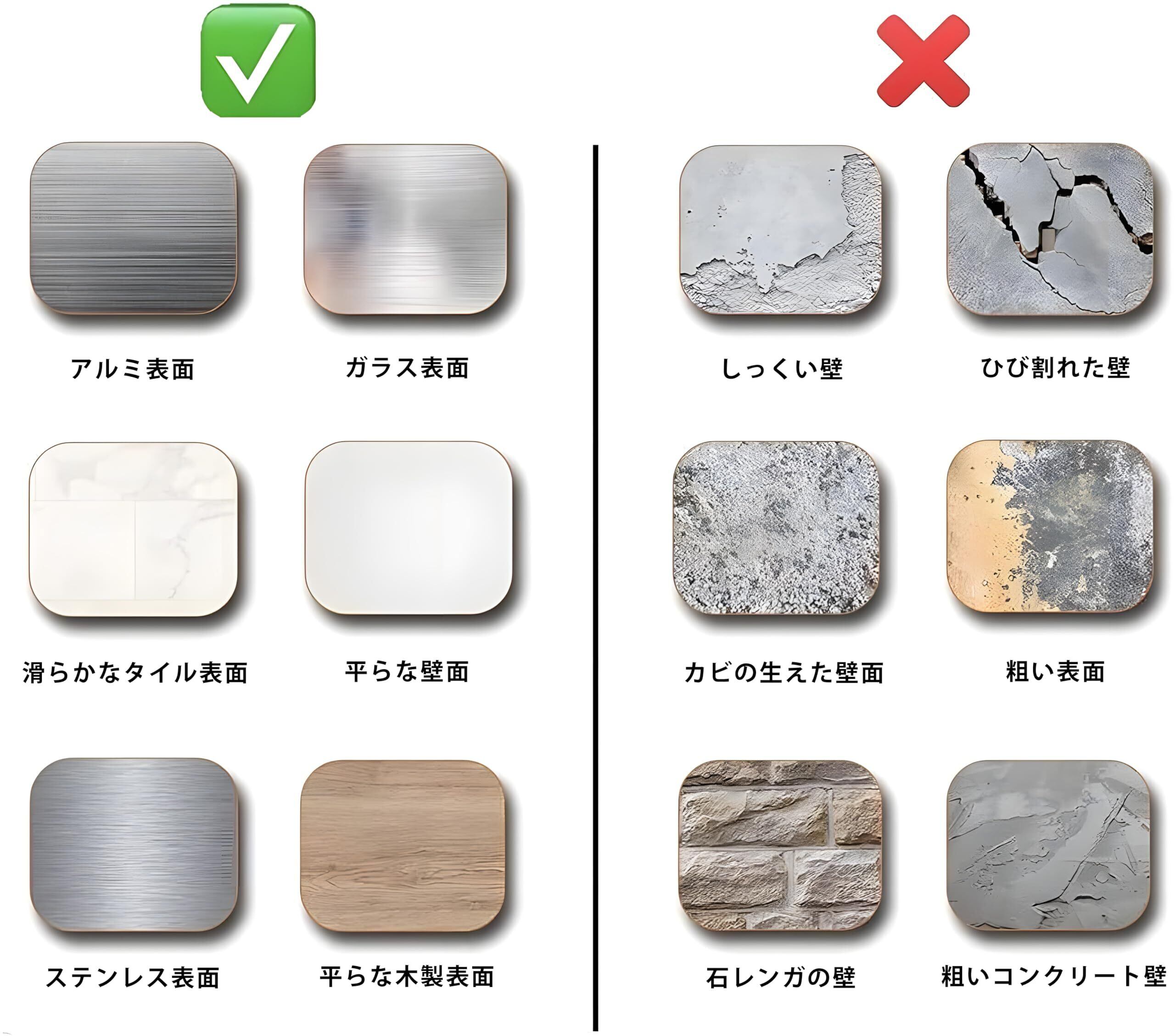 使用面の要求:タイルシールを貼る前に、必ず貼る対象物の埃や汚れを取り除き、表面が滑らかで平らな状態を保証してください。例えば、セラミック表面、ガラス表面、平らなソリッドウッドの板表面などです。粗くて凹凸のある表面に貼り付けるのに適用していません。例えば、レンガの壁、石垣、石膏の壁、剝がれやすい壁紙、灰の壁などです。(関連する壁体表面の製品写真がありますので、ご参照ください。)