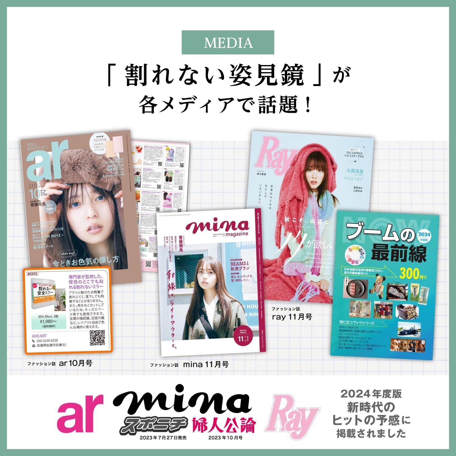 【皆様のお悩みを解決】 クローゼットやトイレのドアに貼りたい 落下や飛散が怖い とがった角でケガをしそう 賃貸住宅で壁掛けができない 赤ちゃんの知育用ミラーを探している このようなお悩み・不安を解決するために開発しました。 ※防水・曇り止め加工はしておりません。浴室ではご使用いただけません。 "