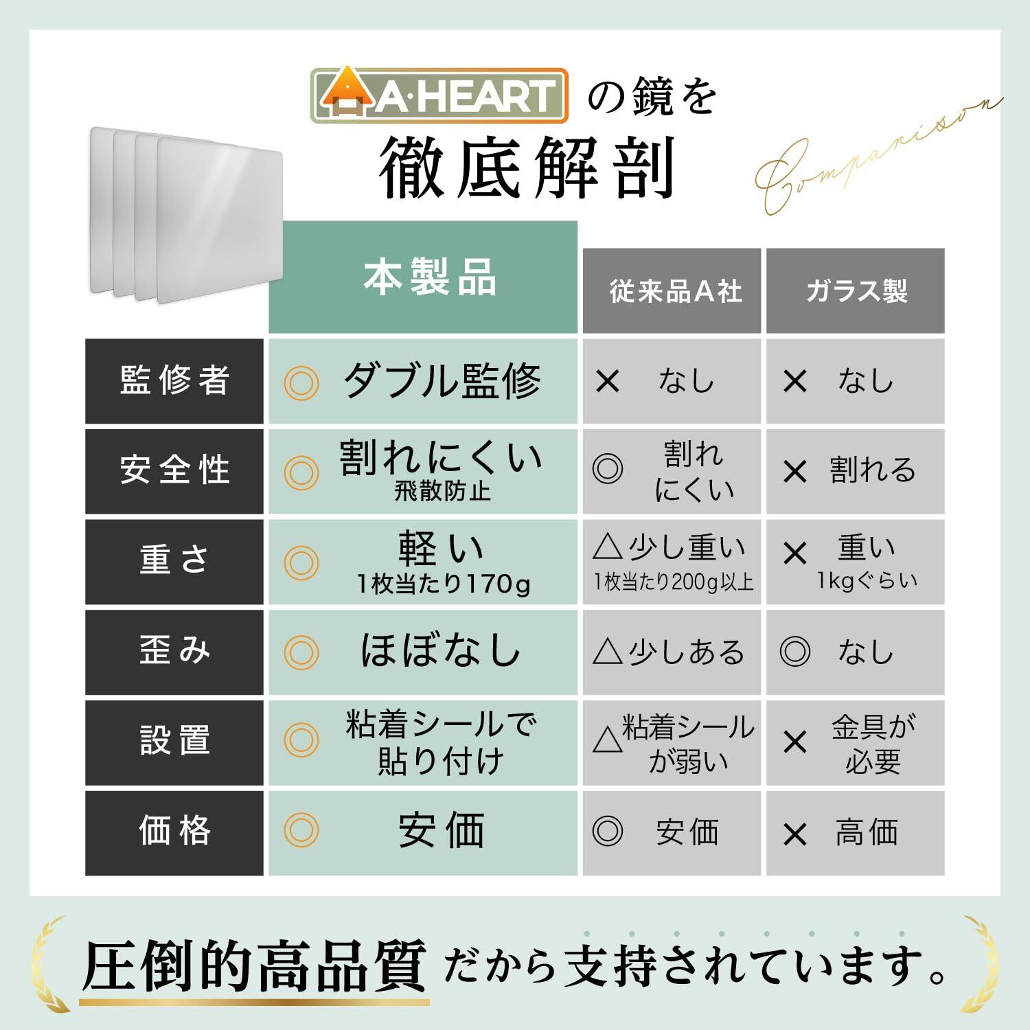 【ココミラーcocomirror 基本仕様】 ・サイズ:縦30cm × 横30cm × 4枚 ・重量:約240g(1枚あたり) ・素材:軽量アクリル製(割れにくい仕様) 軽量で扱いやすく、落下時もガラスのように飛散する心配がありません。 4枚を縦に並べれば全身鏡として使用可能。 1枚使いなら髪型チェックや身だしなみ確認にも最適です。 AHEARTのミラーは、2人の専門家監修のもと開発された「理想のどこでも貼れる割れないミラー」です。