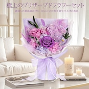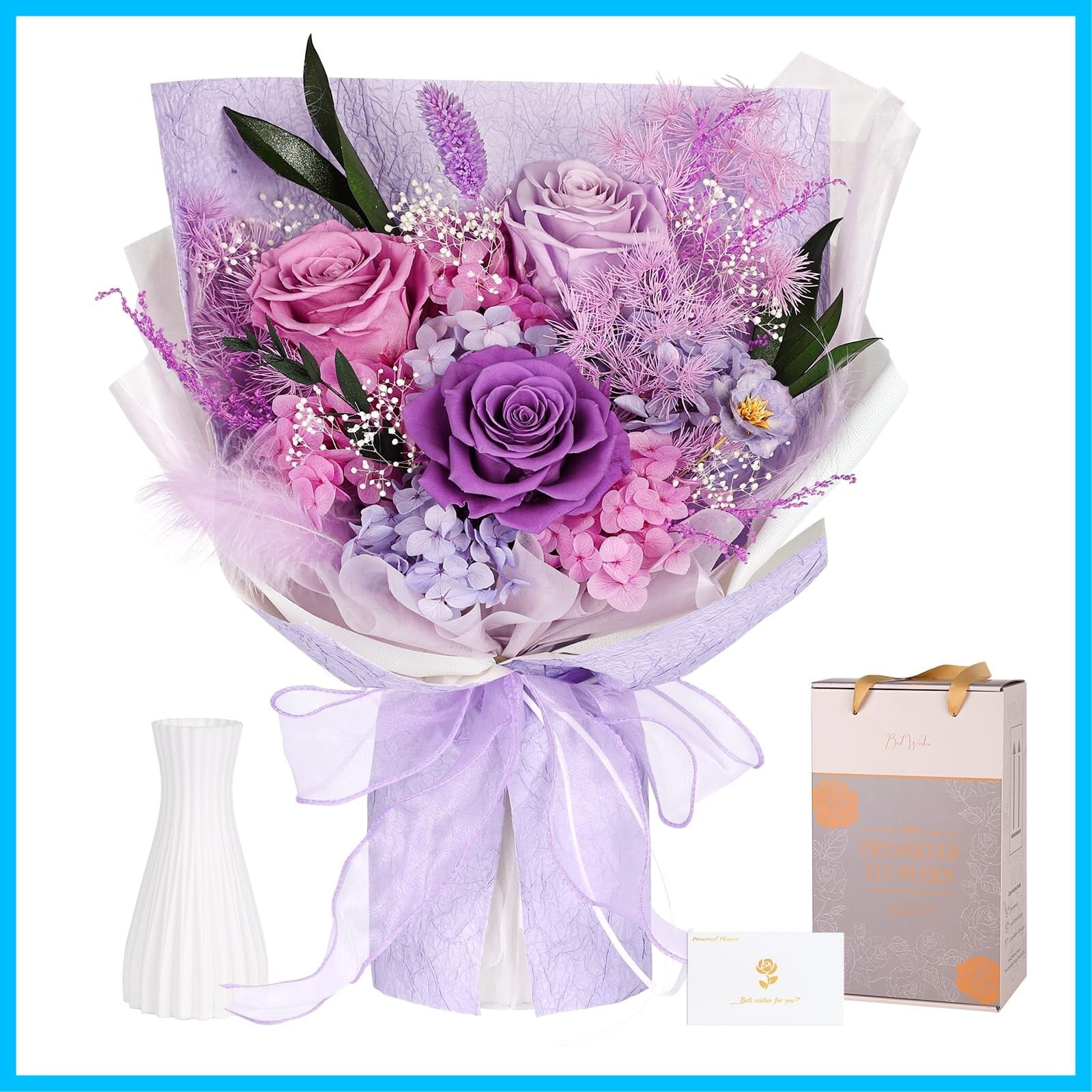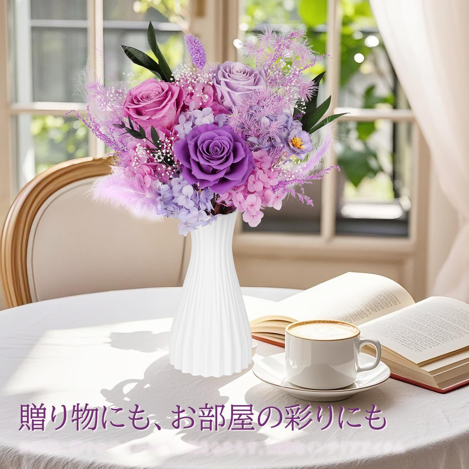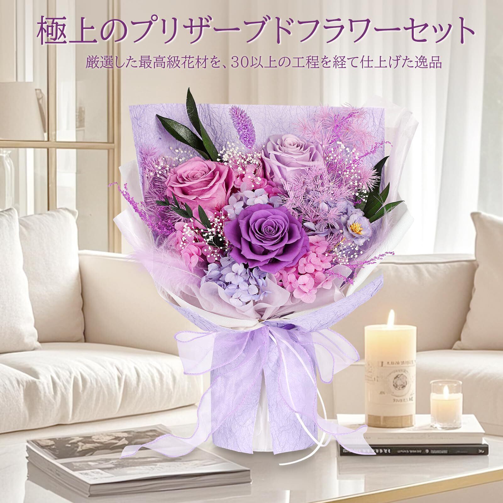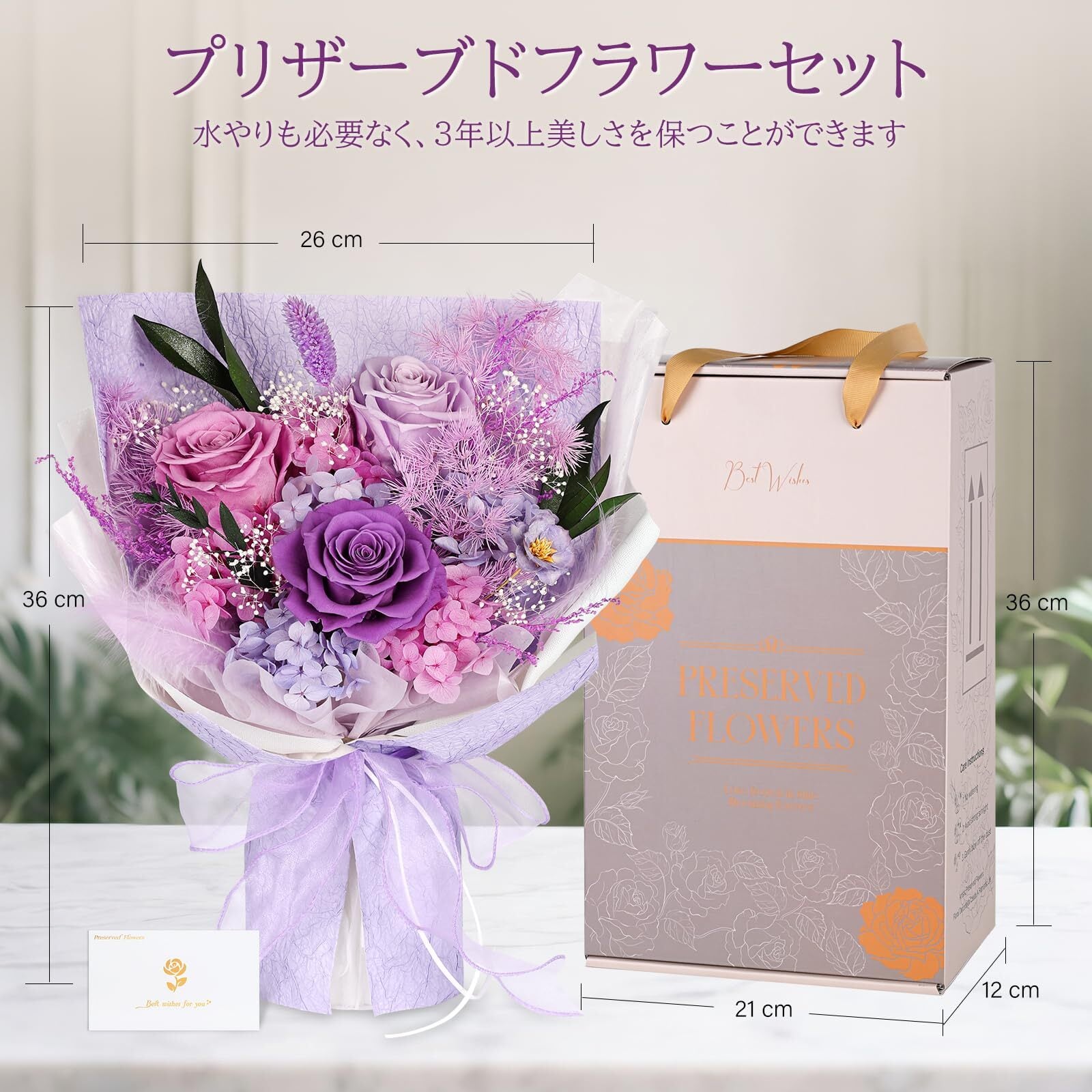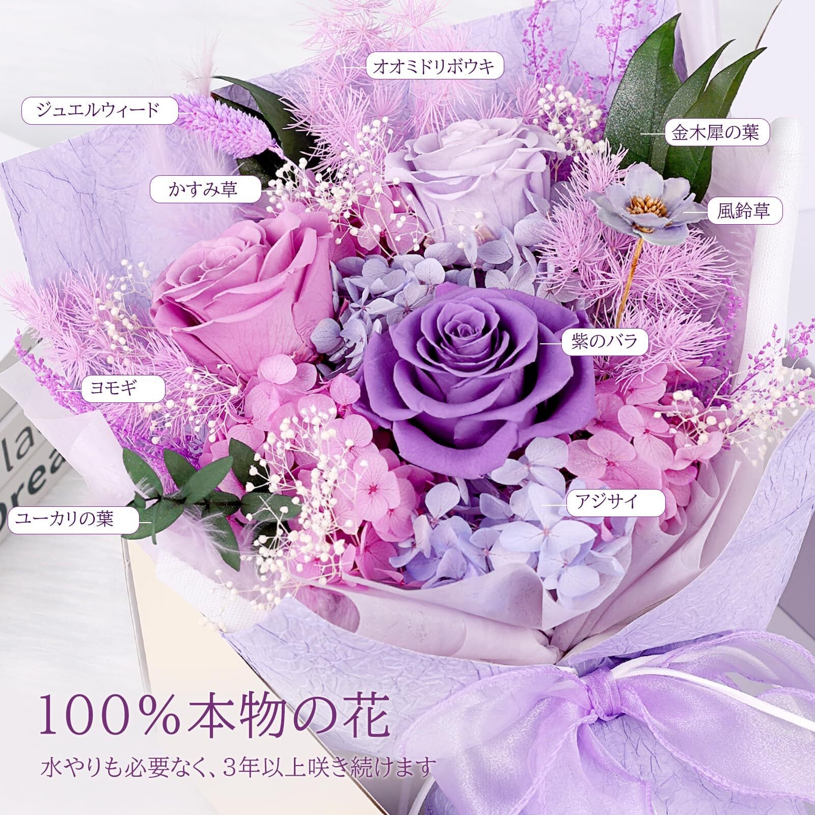 【セット内容】※プリザーブドフラワーの花束(色の濃淡が異なる紫バラ*3本、アジサイ、ヨモギなど)、白い花瓶(「ご注意」リボンを外しラッピングを開けると花瓶が見つかります)、未記入のメッセージカード、手提げギフトボックスが含まれています。