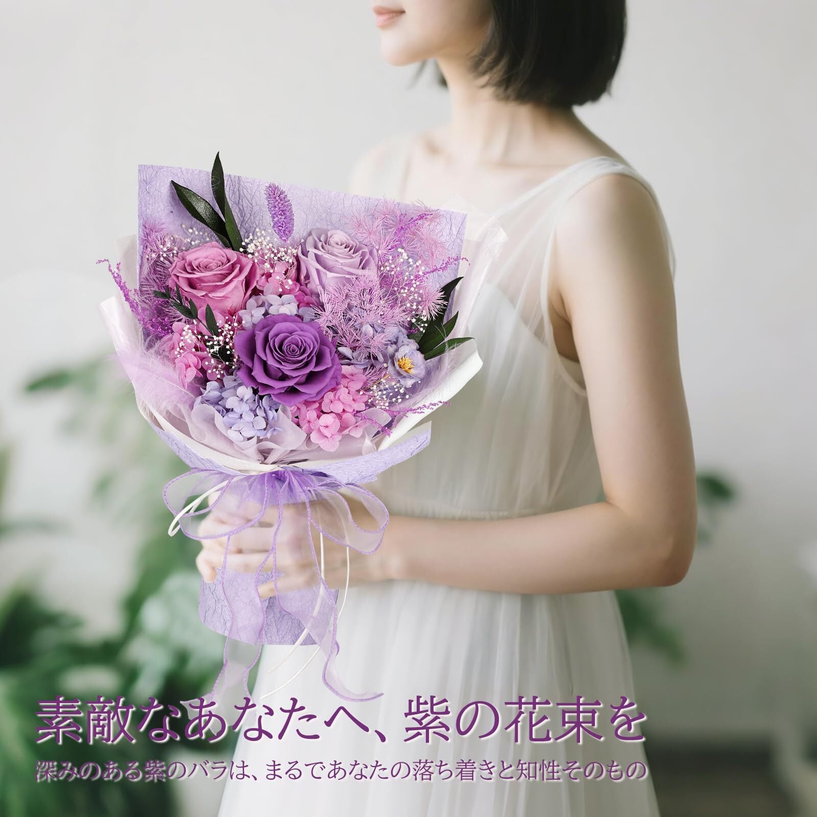 【手入れ不要&3年以上咲き続ける】このプリザーブドフラワーは、水やりや特別なお手入れが一切不要。生花のように枯れる心配がなく、3年以上もの間、初めての美しさを保ち続けます。忙しい毎日でも、手間をかけることなく、ずっと花の魅力をお楽しみいただけます。鮮やかな紫色の花束は、お部屋に華やかで上品な雰囲気をもたらし、インテリアとしても最適です。