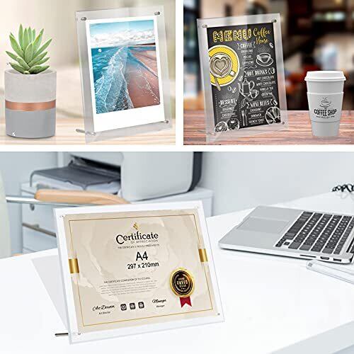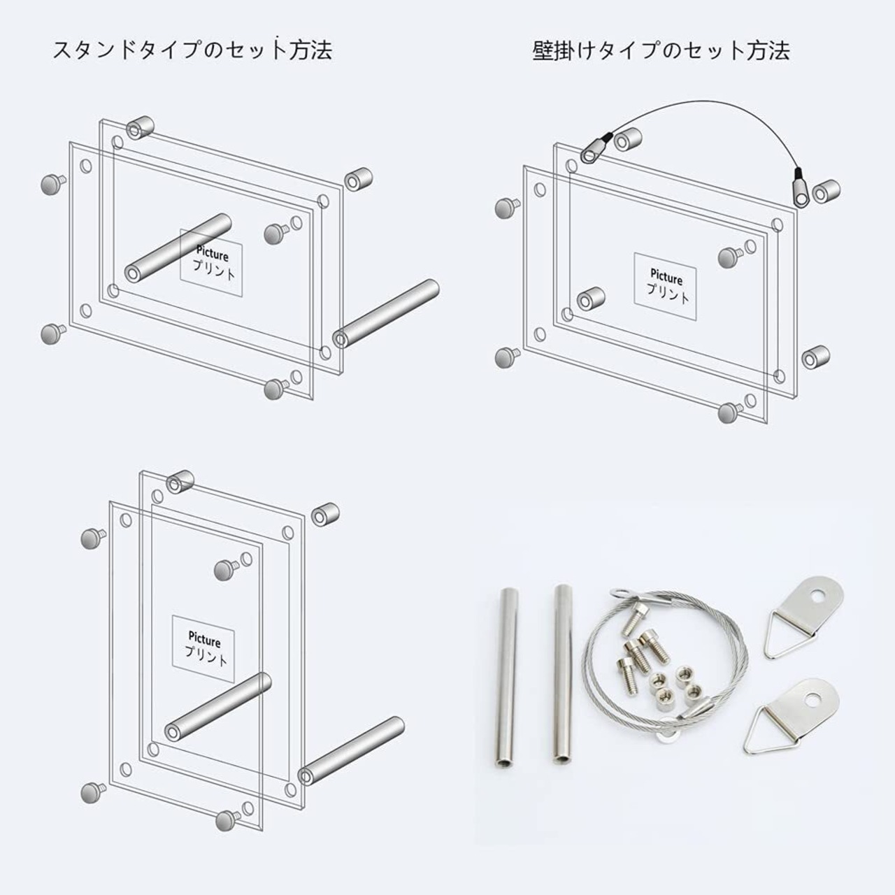【机置き方】2枚アクリル板にオスやメスのネジを取り付ければセットアップ完了、縦置きか横置き、フレームを支えてる支柱の位置を変えると置き方が変えられます。友達にプレゼントや美術館で画展を開くなどもお勧めです。到着後保護膜を剥がしてください。