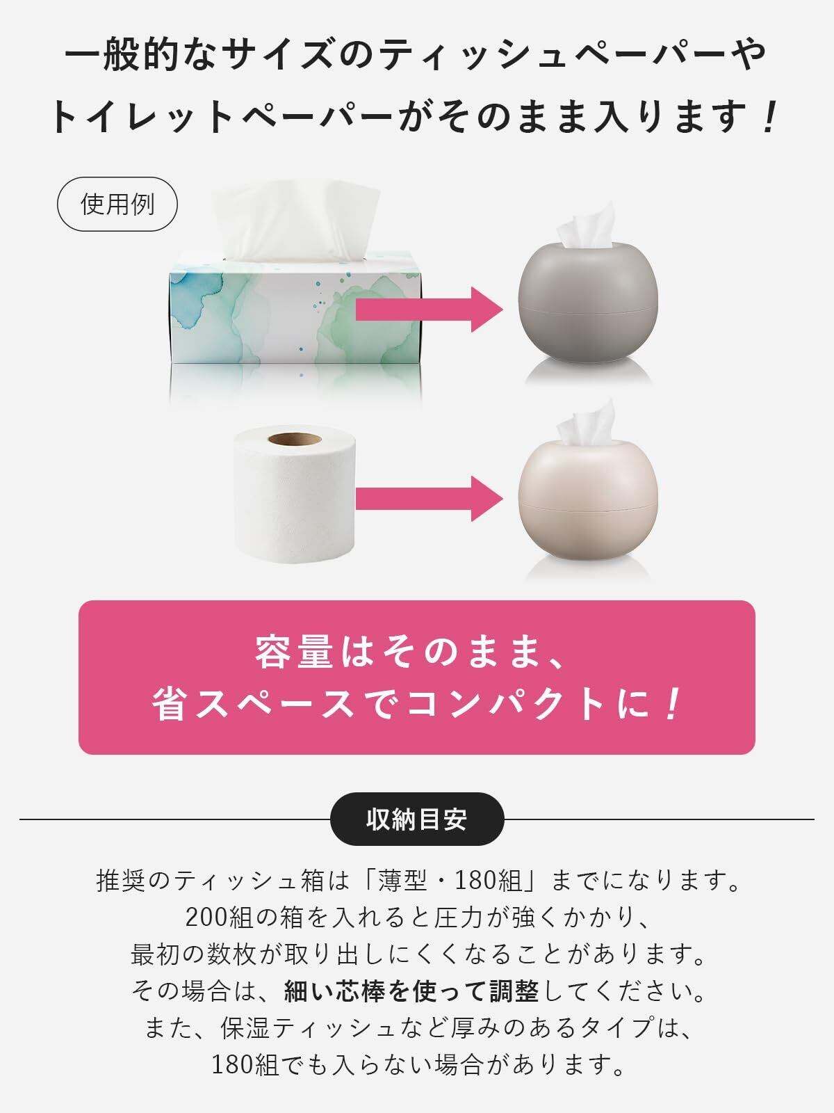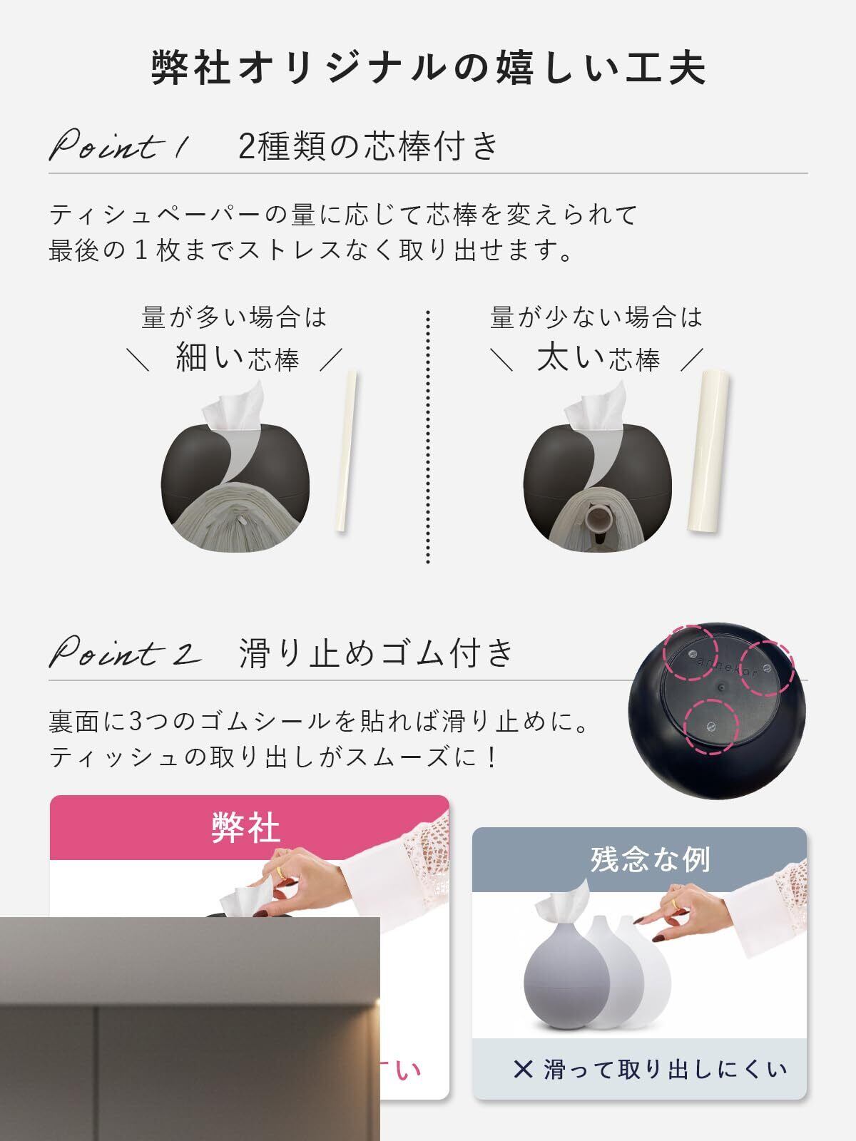 【トイレットペーパーにもボックスティッシュにも対応】中芯にセットして使うため、トイレットペーパーや通常のボックスティッシュのどちらでも使用可能。生活シーンに応じた使い分けができます。いろいろなペーパーに対応できるよう、太さの異なる2本の芯棒をご用意しました。
