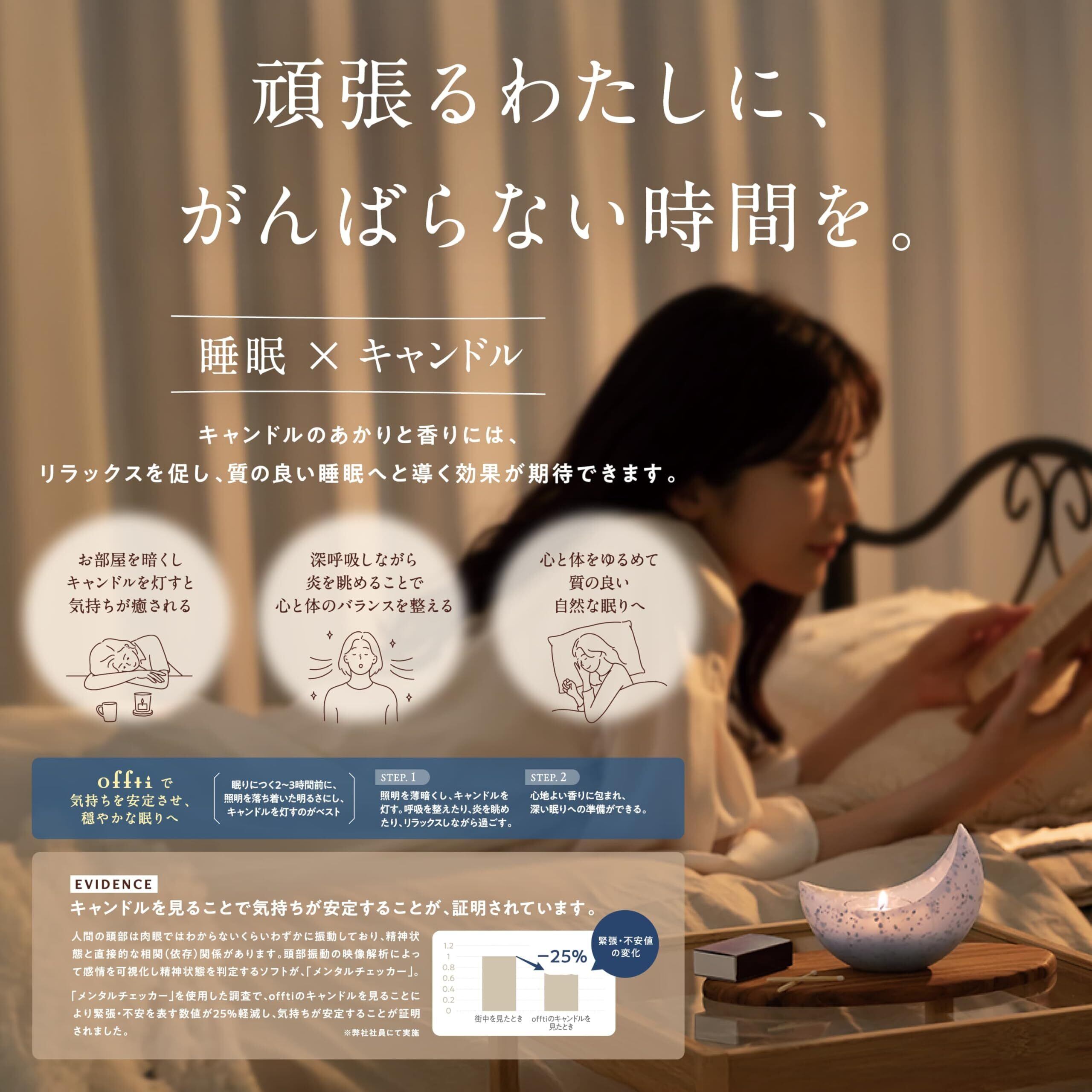 おやすみ前のリラックスタイムをイメージして仕立てたこだわりの香り ・毎日30分の燃焼でも約1ヶ月楽しめる ・クリアカップだから、あかりを最大限楽しめる ・香りの強さは従来品の2倍 ・安心の日本製 ・7種類の香りを気分で選べる