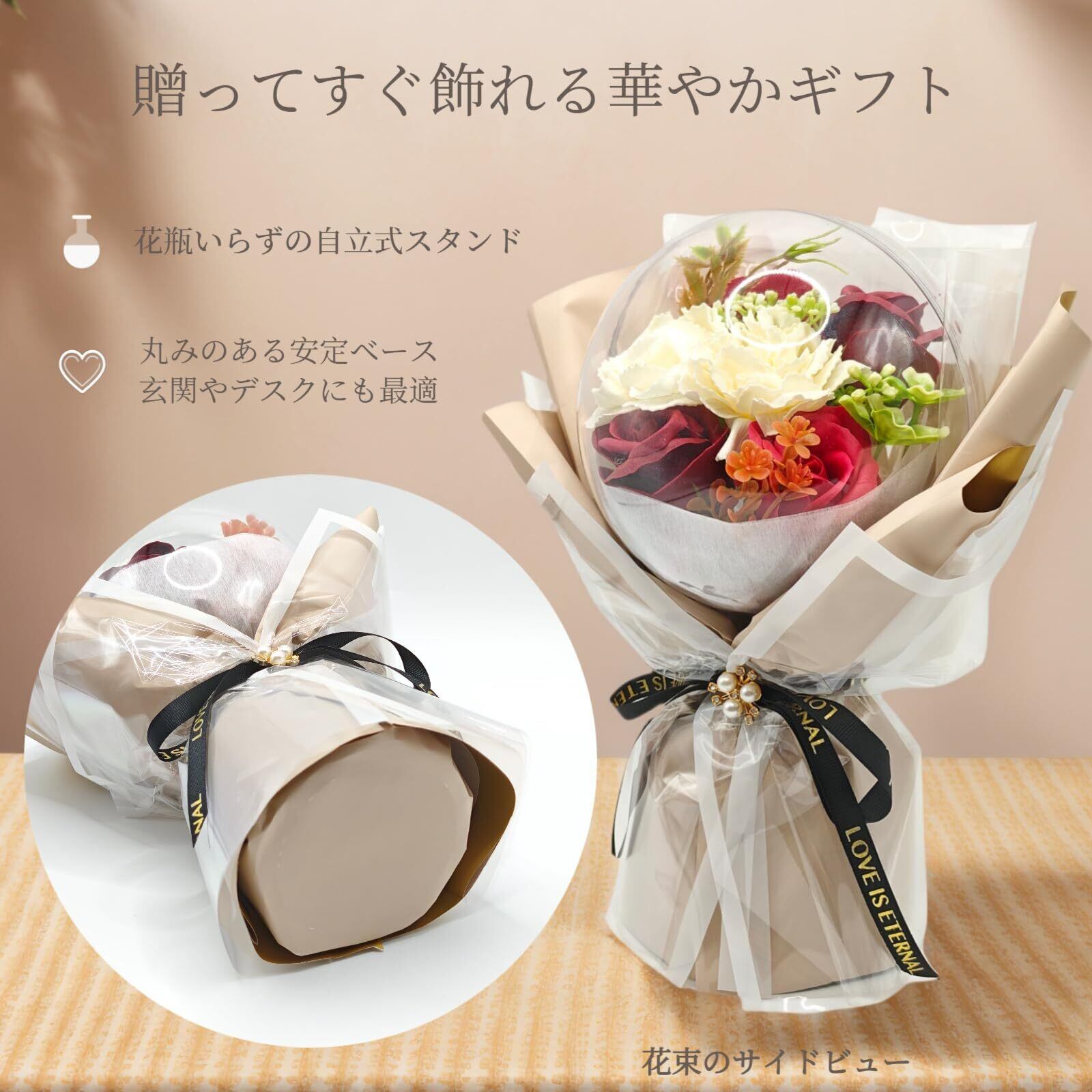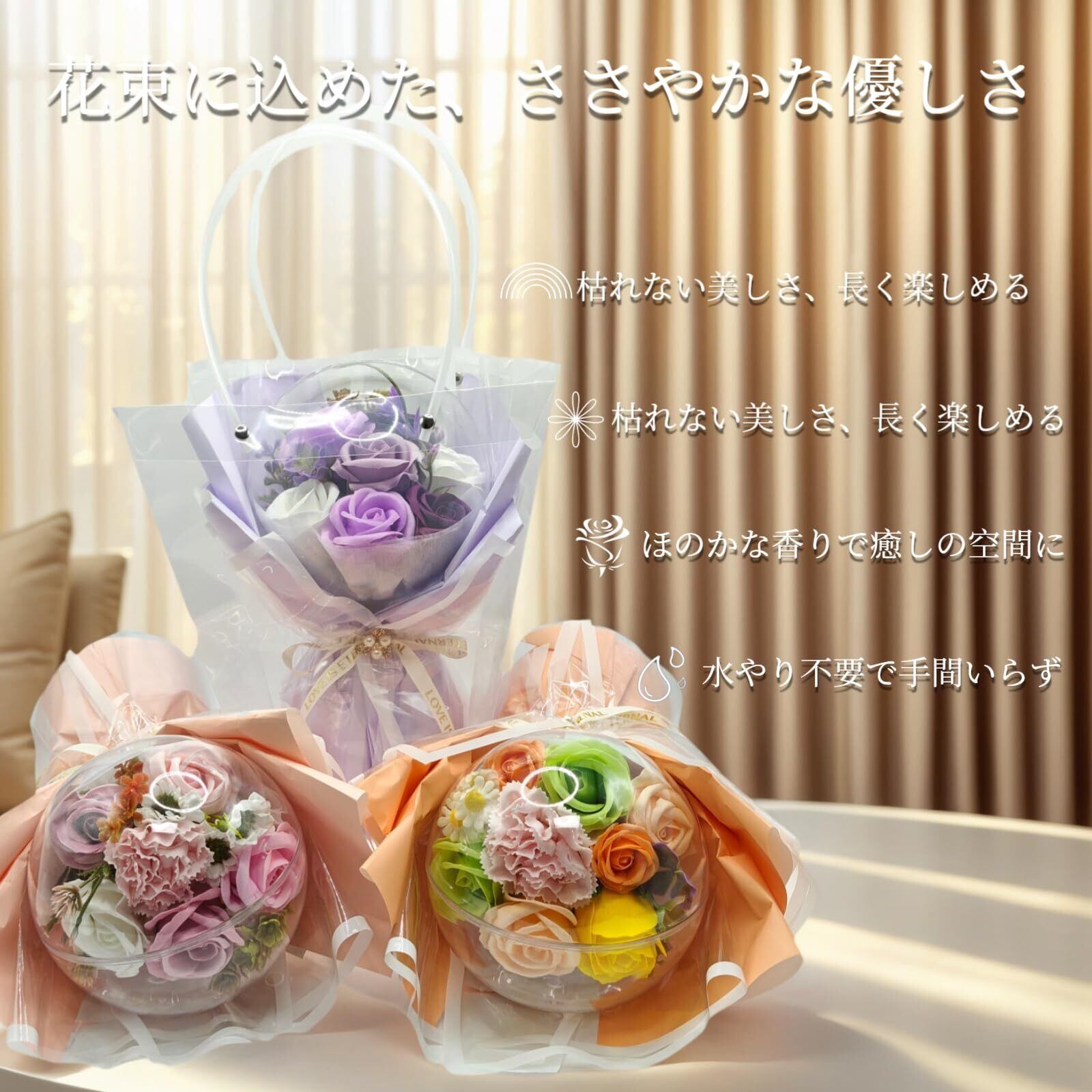 【多彩なギフトシーンに最適】母の日、誕生日、退職祝い、敬老の日、結婚祝い、送別など幅広く活躍。華やかで香り付きのソープフラワーは写真映えし、大切な方への贈り物にぴったりです。