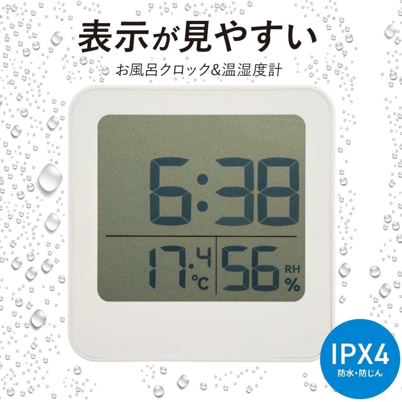 【 仕 様 】 ◆温度表示範囲:-20~50℃ ◆温度測定精度:0~40℃で±1℃ 左記以外で±1.5℃ ◆湿度表示範囲:20~99%RH ◆湿度測定精度:35~85%RHで±5% 左記以外で±8% ◆時計精度:約±30秒/月 ◆防水性能:IPX4(防まつ形…あらゆる方向からの飛沫による有害な影響がない ※JIS C 0920:2003による)
