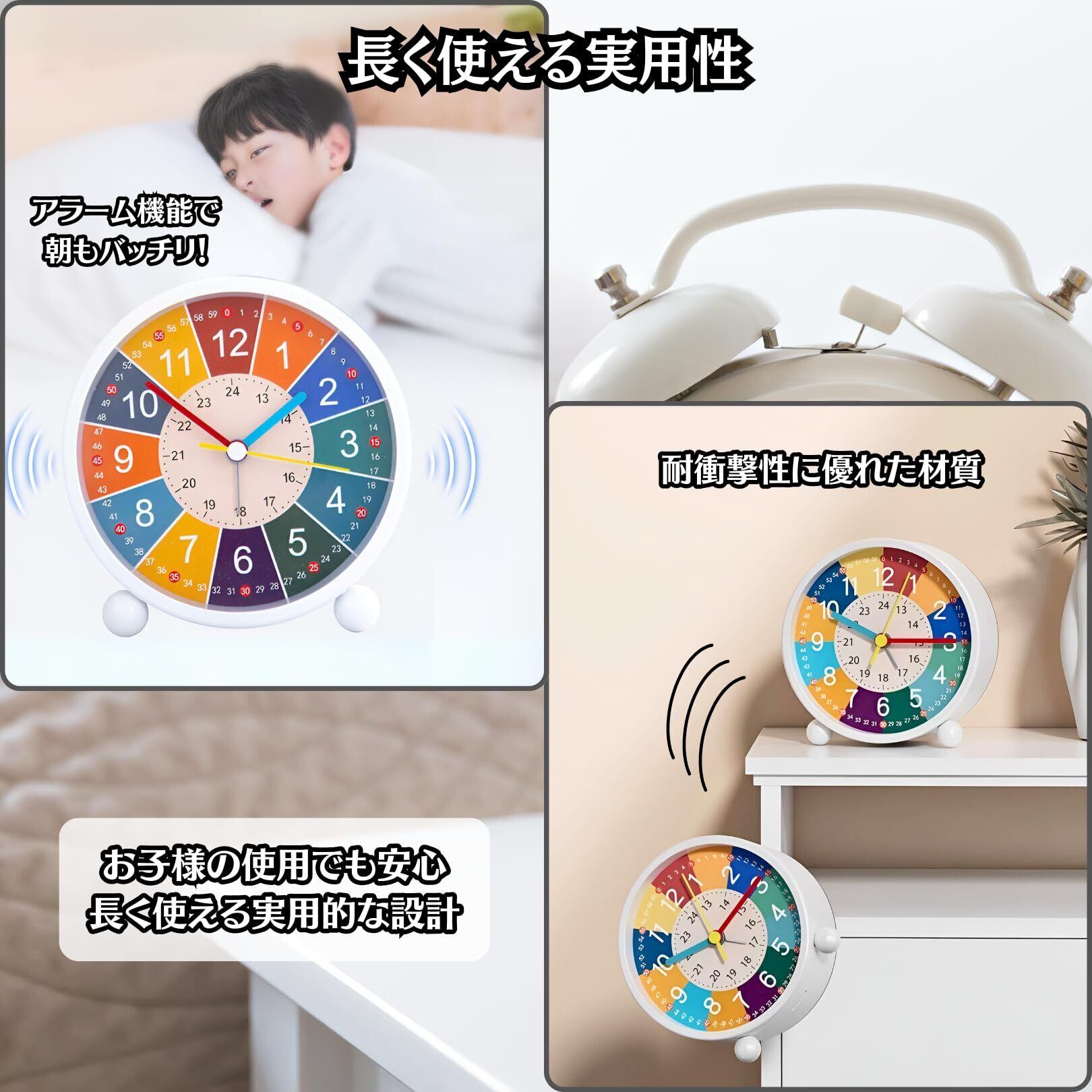 【可愛く学べる目覚まし時計】細かく刻まれた数字で視認性が高く、子供の学習にも適した目覚まし時計です。可愛らしいデザインでインテリアとしてもお部屋に馴染みやすく、実用性も抜群!子供部屋を彩りながら、時計の読み方を自然に学べる優れた知育アイテムです。