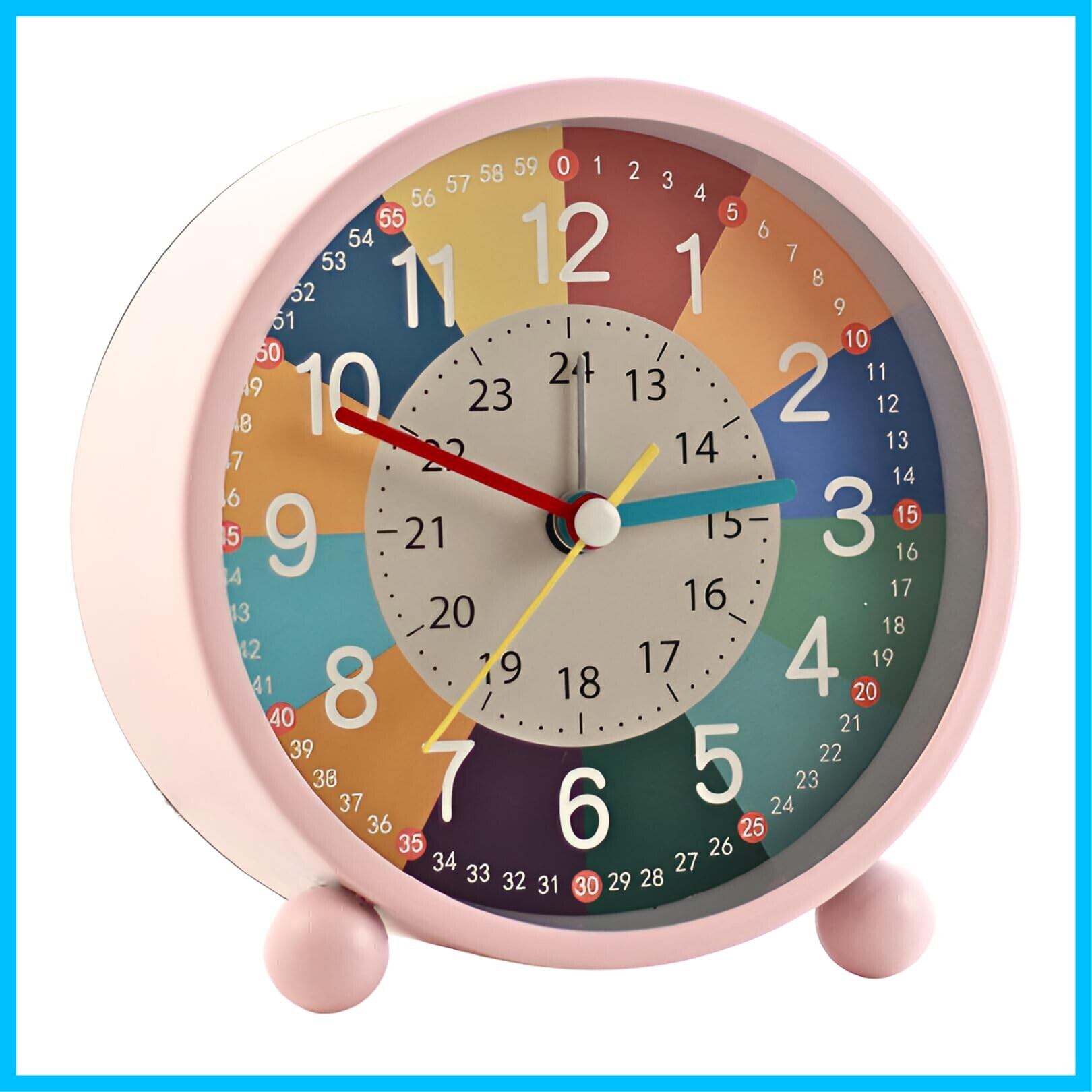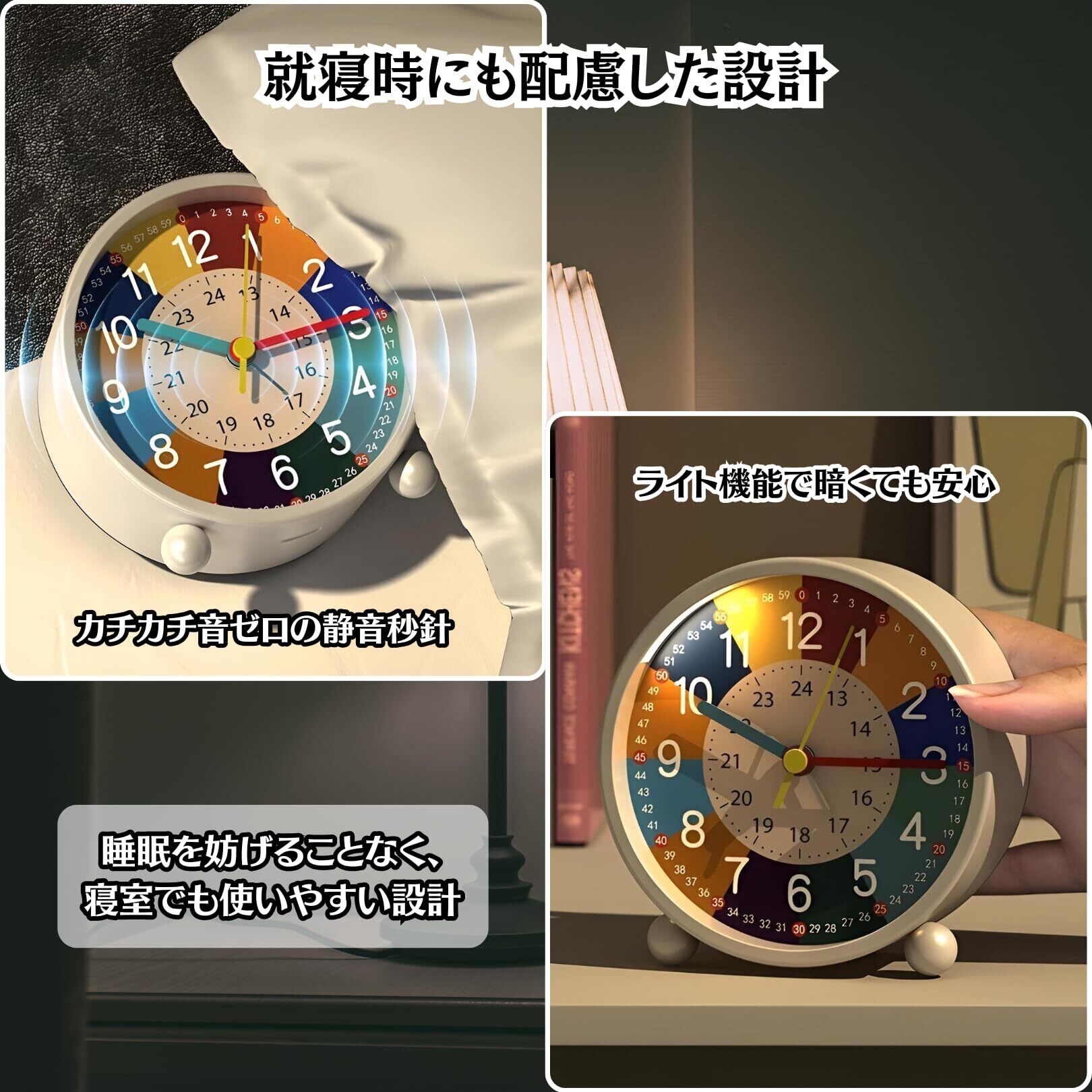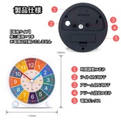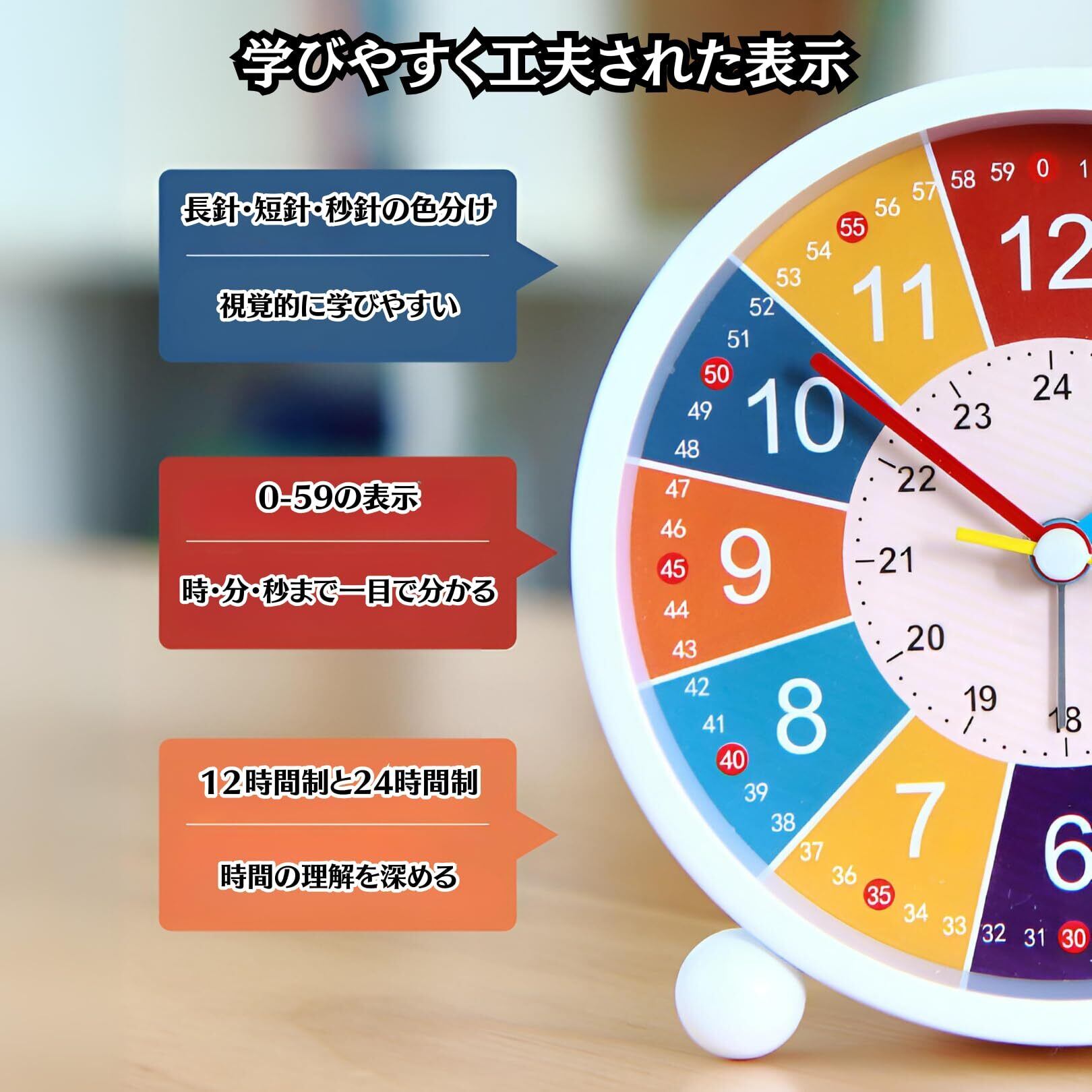 【楽しく学べる色分け表示】長針・短針・秒針が色分けされているため、時間の学習が楽しくなります。1-60までの表示で何時何分何秒まで一目でわかり、教えやすい設計です。さらに、文字盤には12時間制だけでなく24時間制の表記もあり、お子様の時間理解を深めるのに最適です。