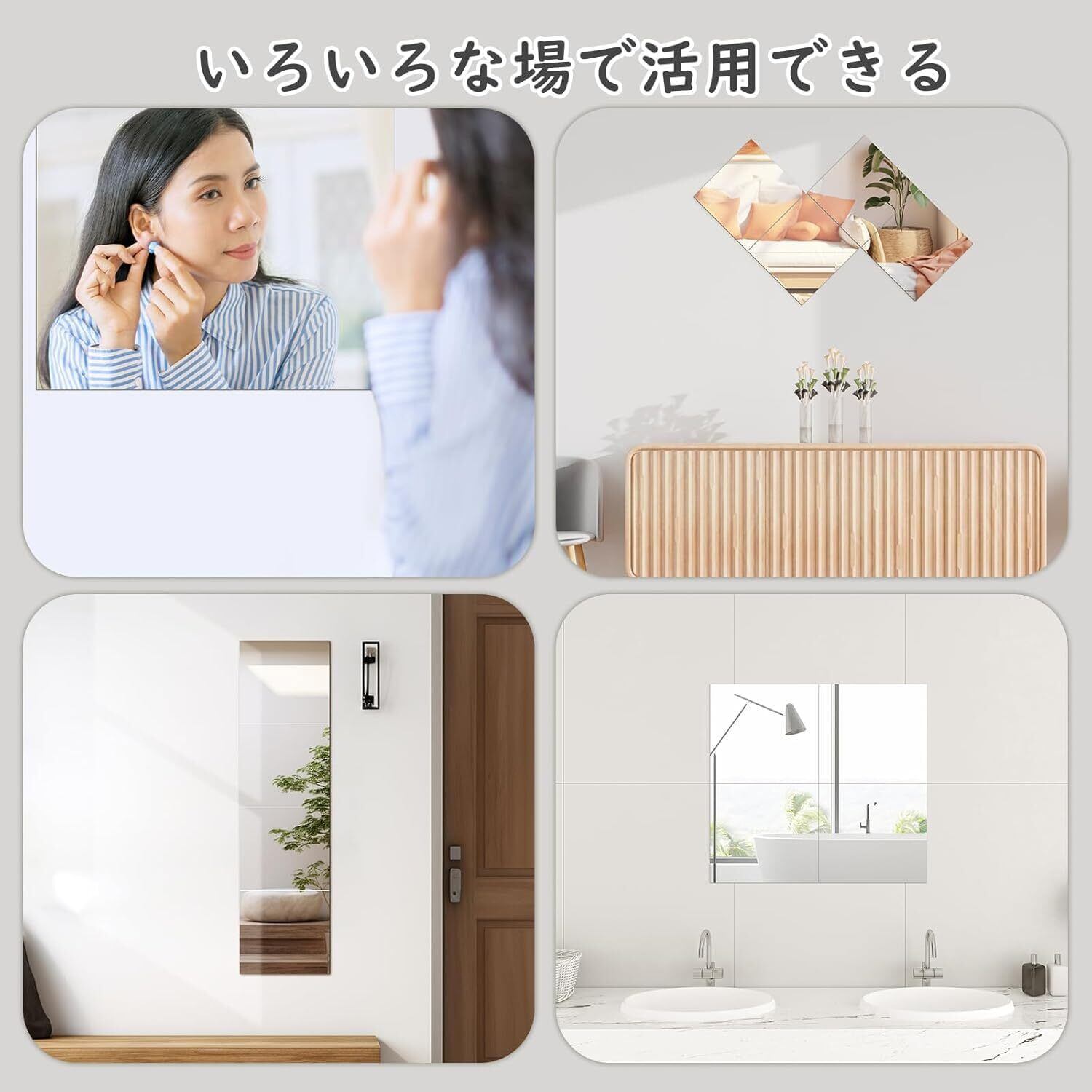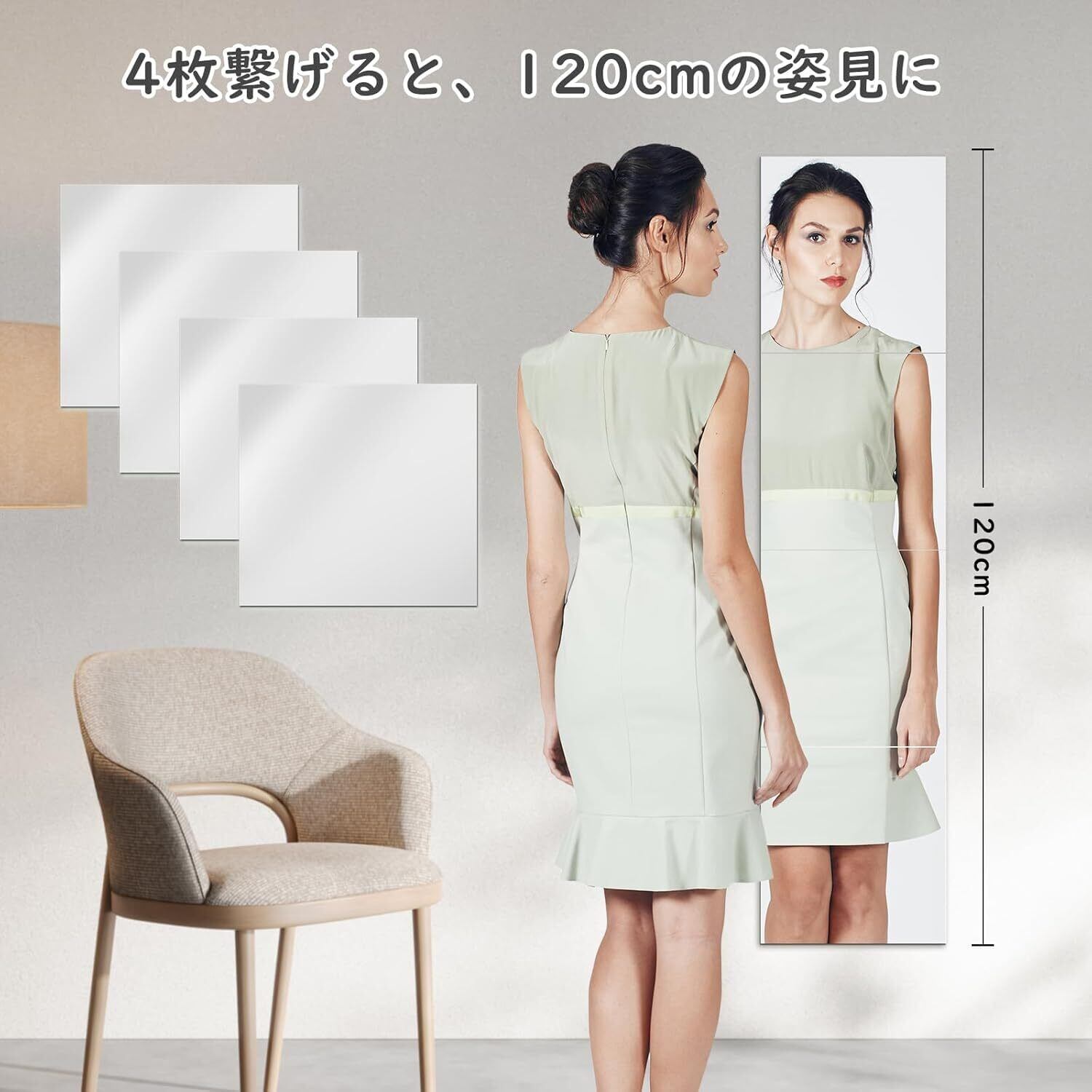 【4枚セットで完璧な全身映し】28cm×30cm鏡面4枚を縦に並べると、高さ120cm×幅28cmまたは高さ112cm×幅30cmの全身鏡を実現します。また、4枚の鏡を自由に組み合わせることで、多様なニーズに対応することができるため、玄関や浴室、更衣室など、あらゆる場所で活躍します。28cm×30cmは正方形ではないので、セット時は設置方向にお気を付けください。