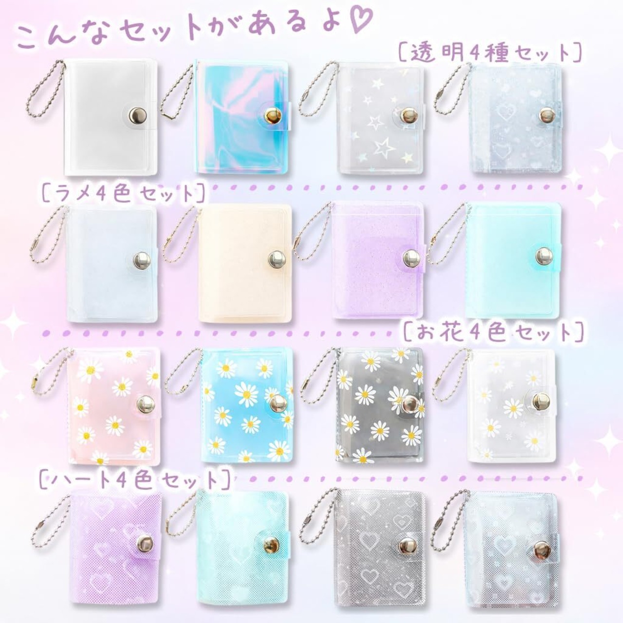 商品説明:お気に入りの写真やカード、シールをかわいく持ち歩ける、AbonAbonのミニ フォトアルバム用アクセサリーですラメ4色のセット、色はクリア、ピンク、水色、むらさきの4色です。 中身が見えるクリアタイプで整理や入れ替えも簡単です。ボールチェーン付きでランドセルやポーチに取り付け可能。小学生の女の子へのプレゼントにもおすすめです