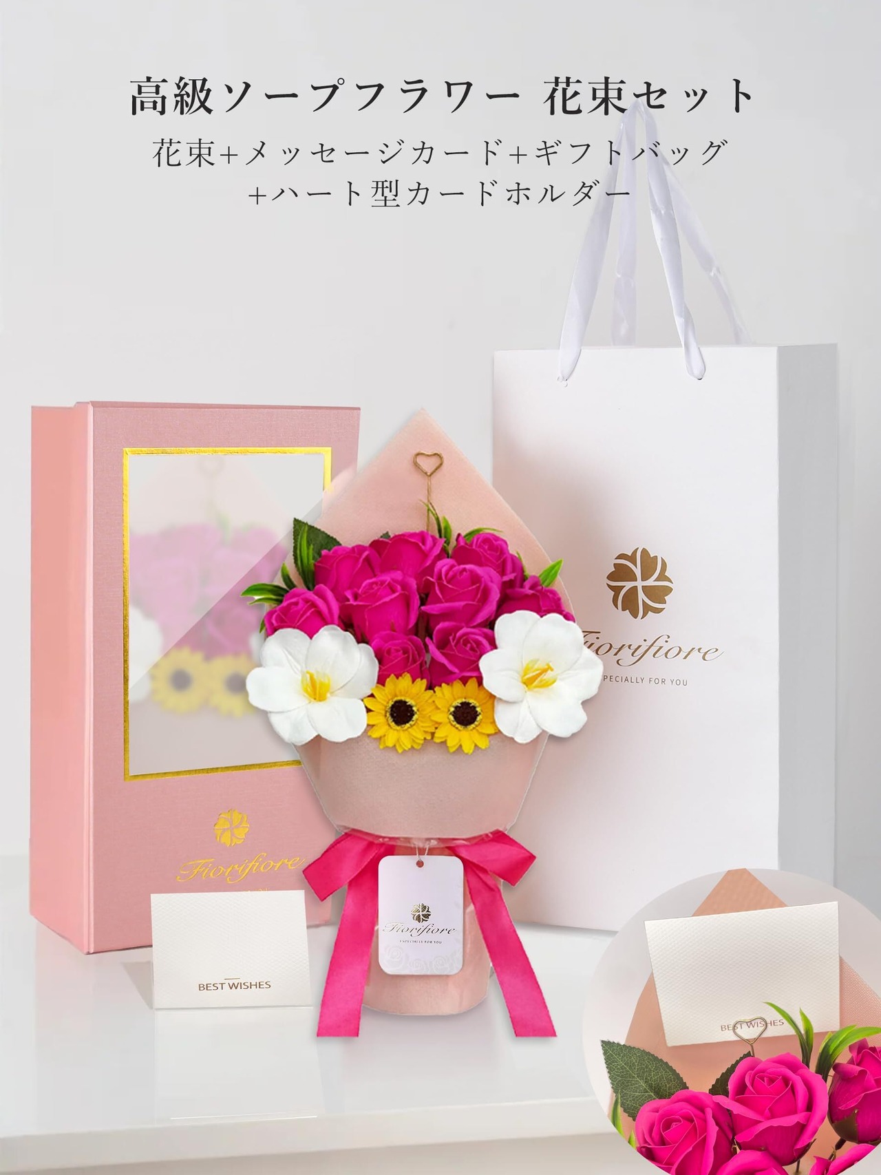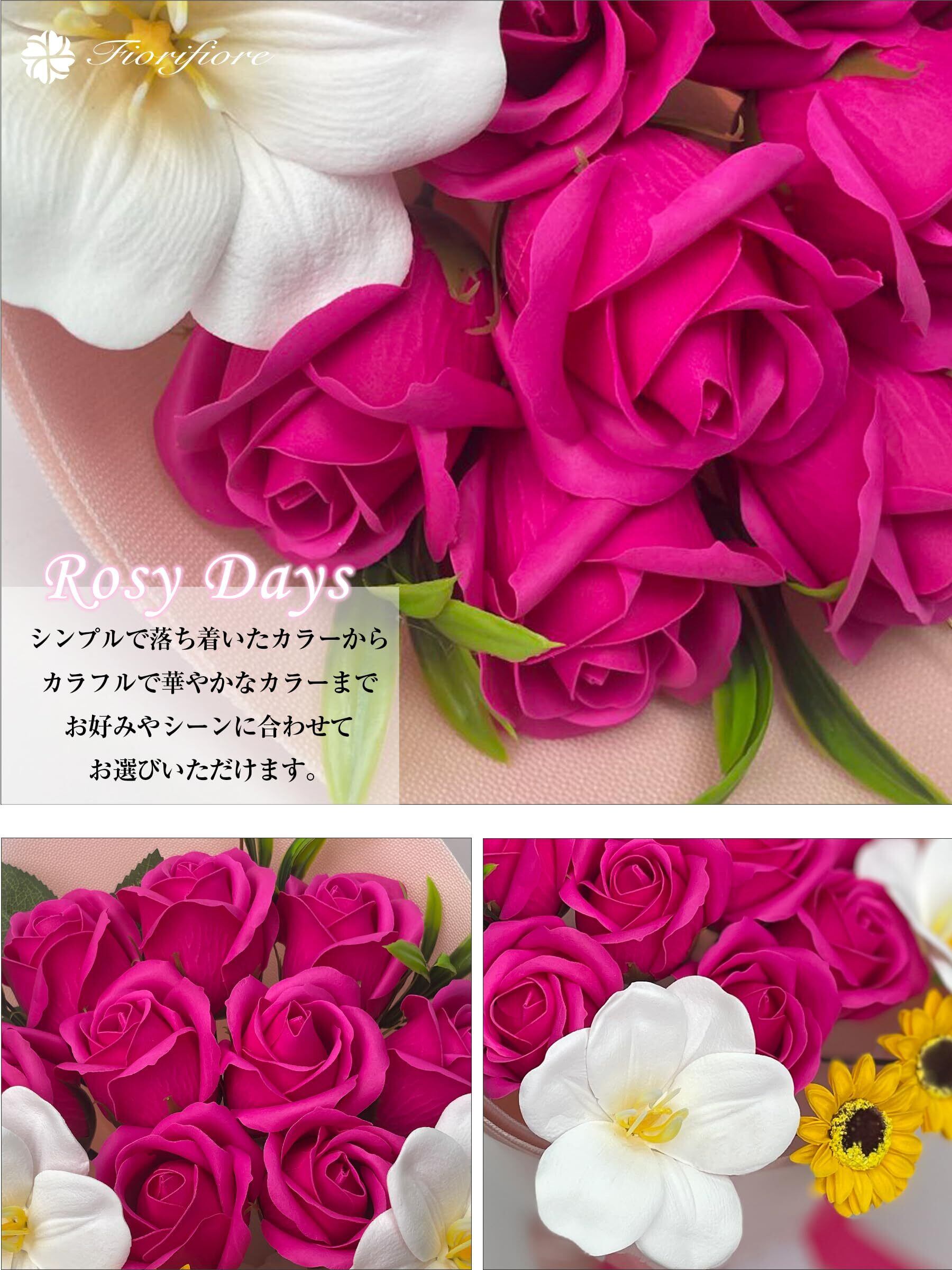 ② ソープフラワーが選ばれる理由:1.手入れ不要で枯れない!長く美しさを楽しめます。2.プリザーブドフラワーよりボリュームたっぷり。3.鮮やかな色彩と優しい石鹸の香りで癒されます。4.花粉がないため、アレルギーの心配が不要。5.見た目も香りも楽しめる理想のフラワーギフト。