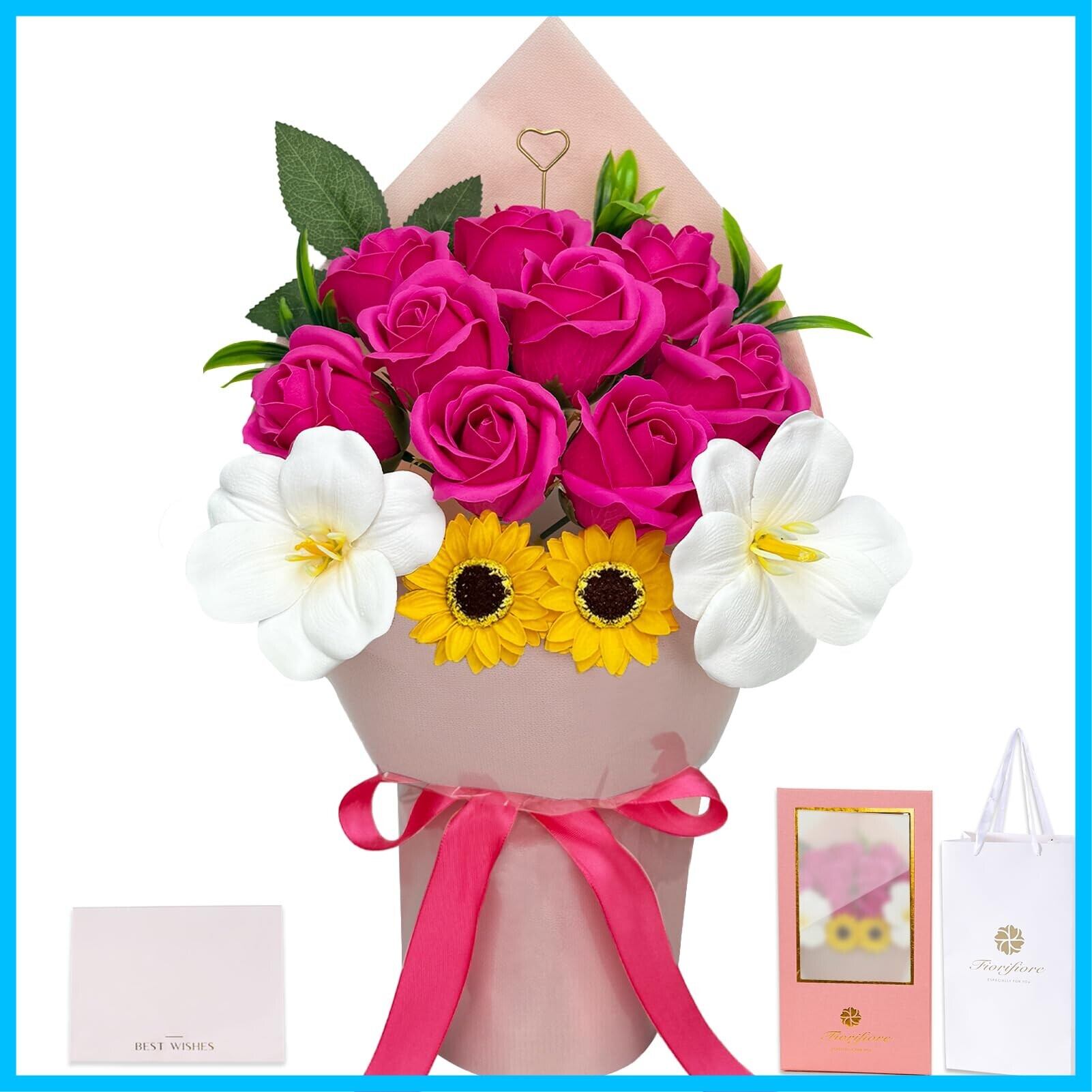 ③ ギフトボックス付きで贈り物に最適:専用ギフトボックス&手提げ袋付きで、すぐにお渡し可能。しっかりしたボックスで高級感を演出し、無料のメッセージカードも付属。花束サイズ:約32×16×9cm、総重量:約520gと、ボリューム感たっぷりの華やかなプレゼントです。