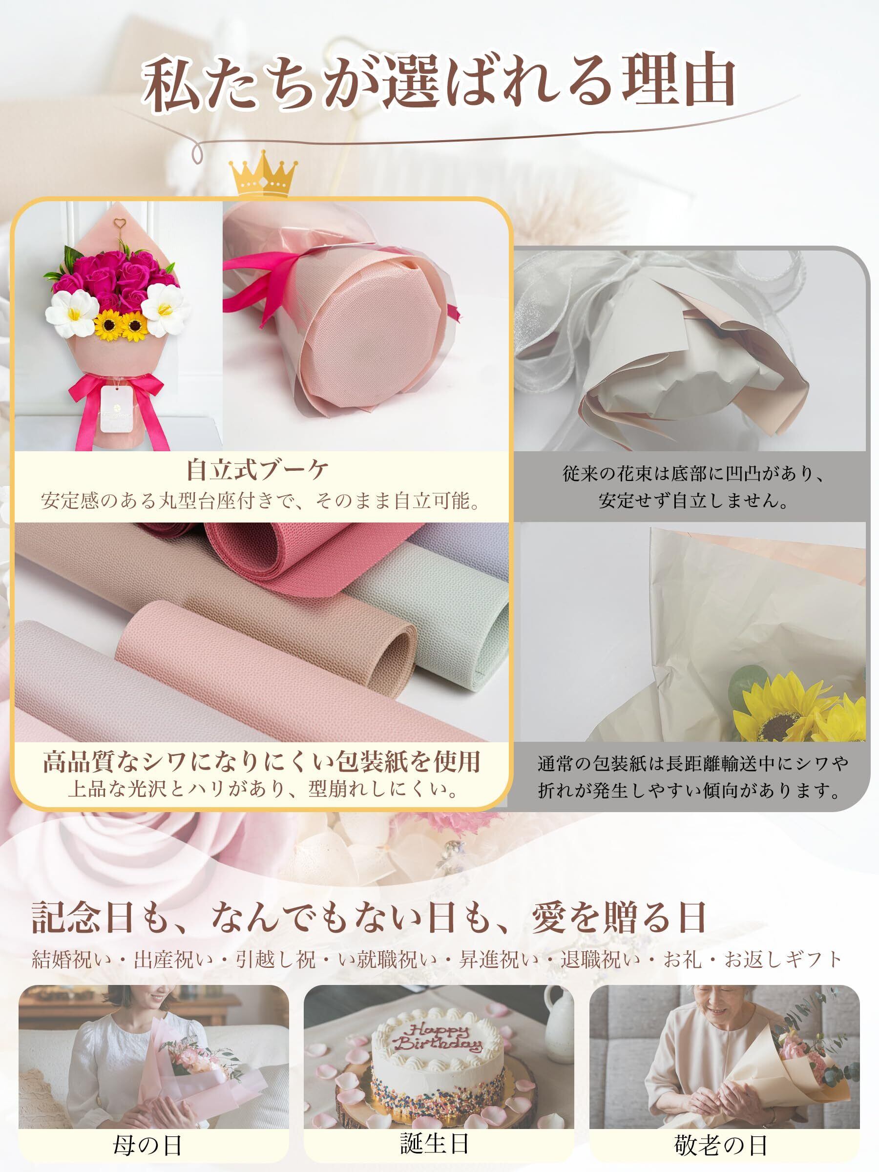 ⑤ 多様なギフトシーンに対応:誕生日、母の日、敬老の日、結婚祝い、開業祝い、記念日、バレンタインデー、退職祝いなど、あらゆるシーンで活躍するフラワーギフトです。ビジネスギフトやイベント、ホームパーティーにも最適。特別な気持ちを届ける贈り物として幅広くお使いいただけます。